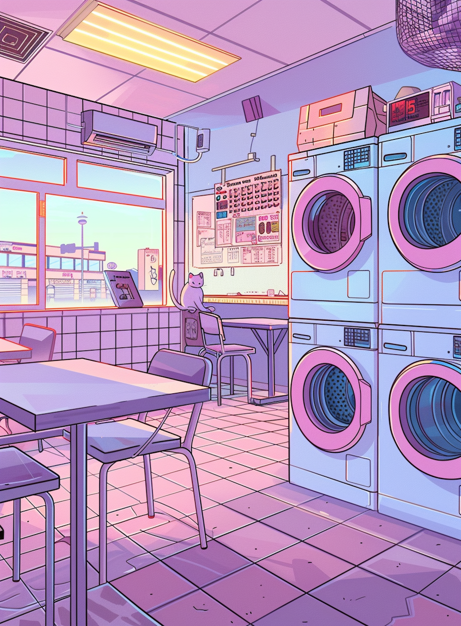 Pastel-hued laundromat with washing machines, a cat on a chair, and a cityscape view, creating a serene and whimsical atmosphere.