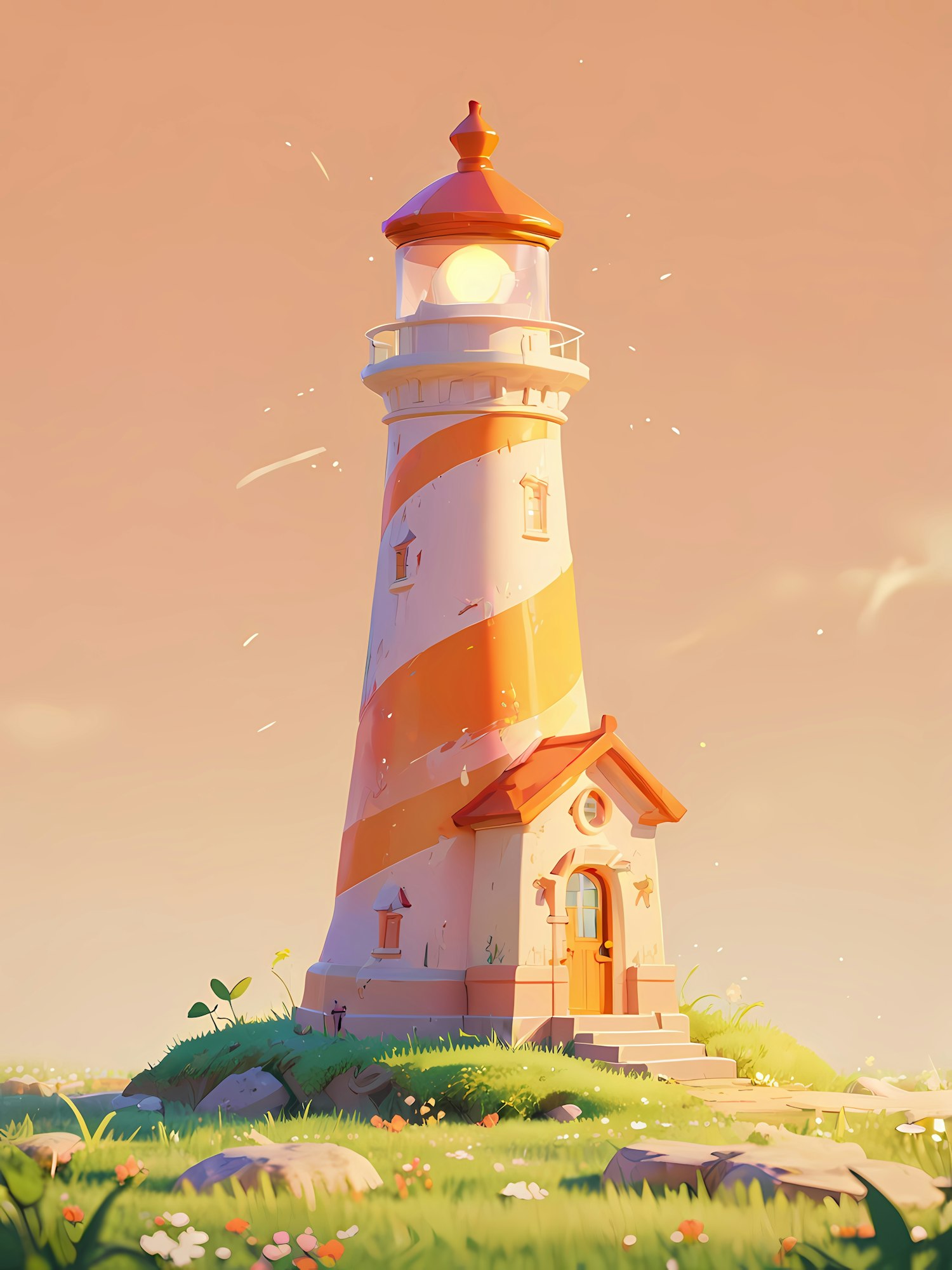 Charming lighthouse illustration with orange-white stripes, glowing light, and lush grassy surroundings under a pastel sky.