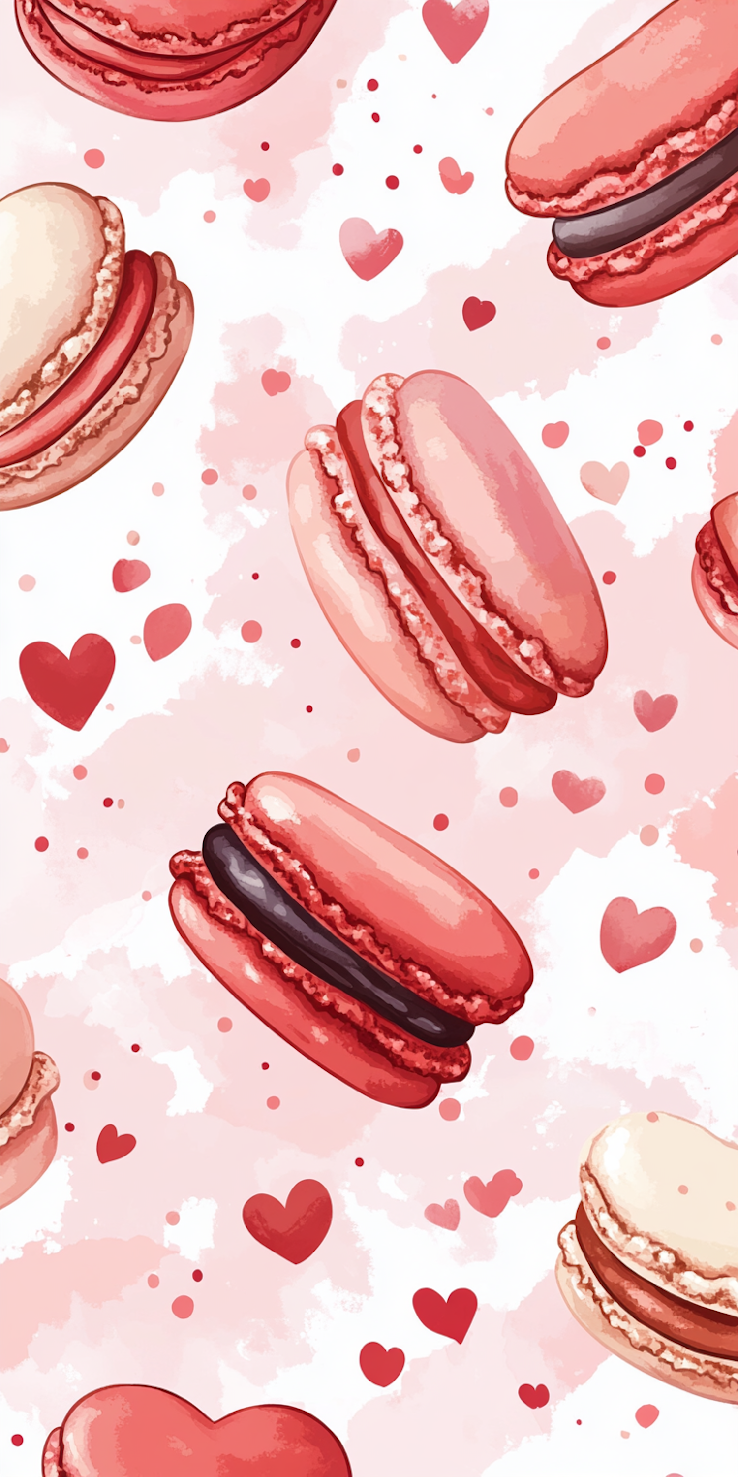 Charming watercolor illustration of colorful macarons and hearts on a pink background, perfect for a sweet and romantic theme.
