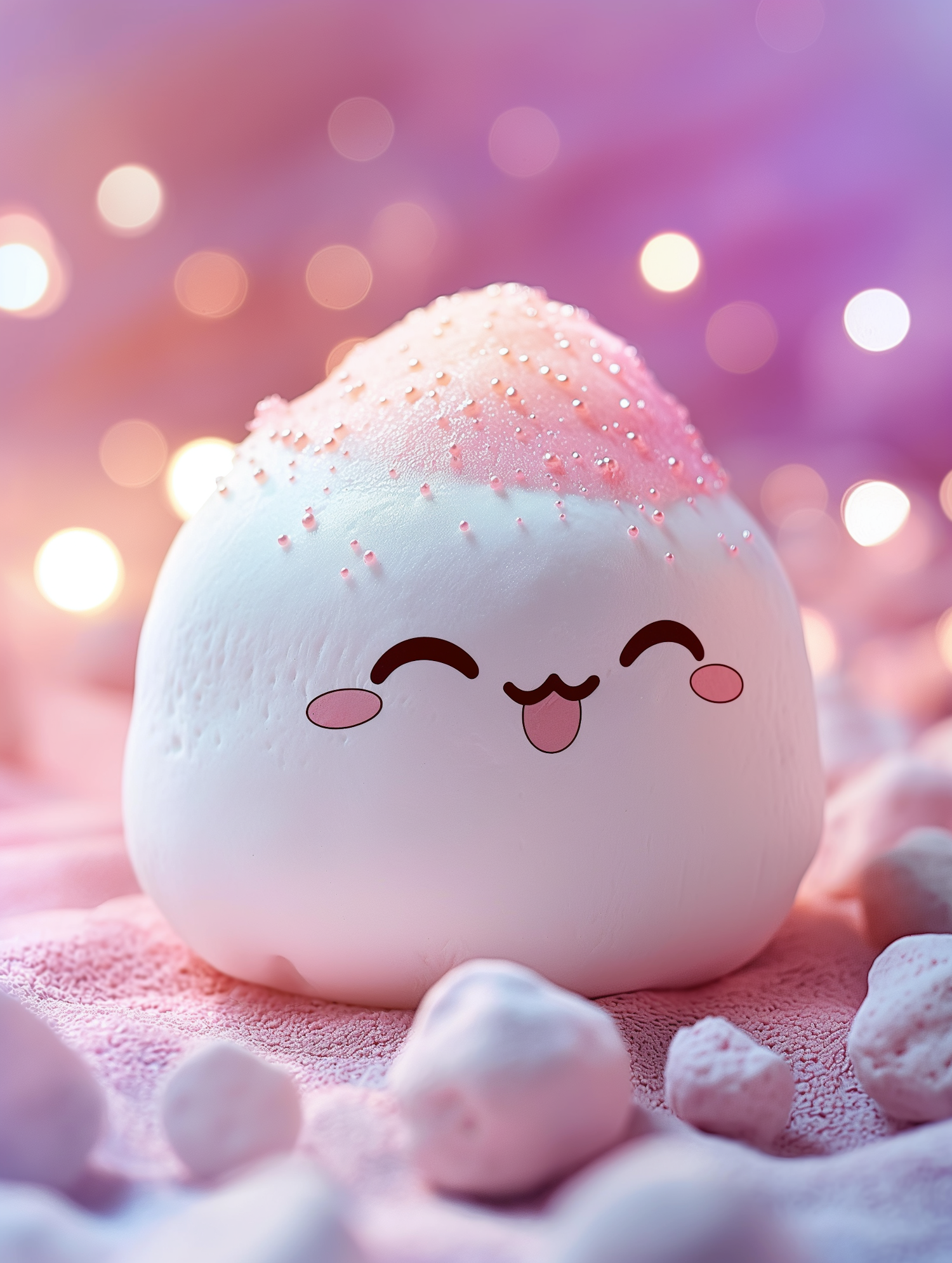 Adorable marshmallow character with a pink sugar top, smiling on a dreamy pink background with bokeh lights.