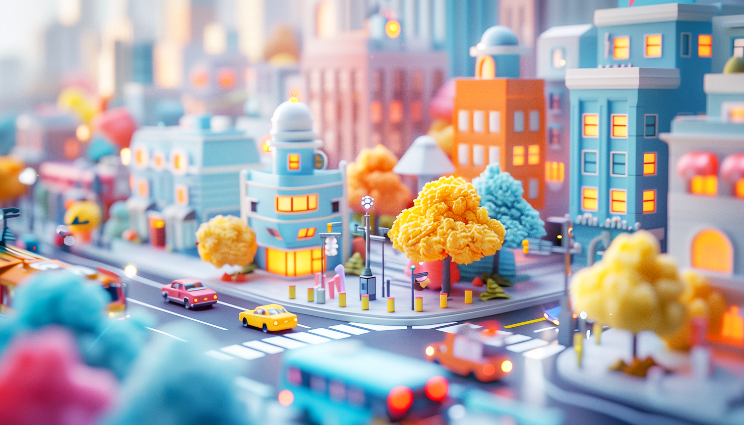 Whimsical cityscape illustration with colorful buildings, vibrant trees, and toy-like cars, creating a playful urban scene.