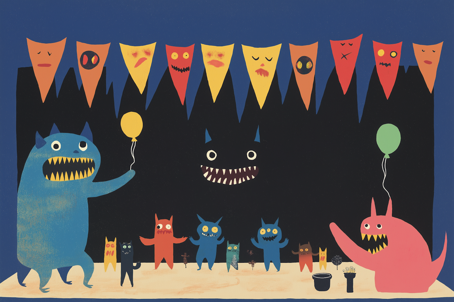 Colorful cartoon monsters celebrate with balloons and flags in a whimsical night-time scene. Playful and lively illustration.