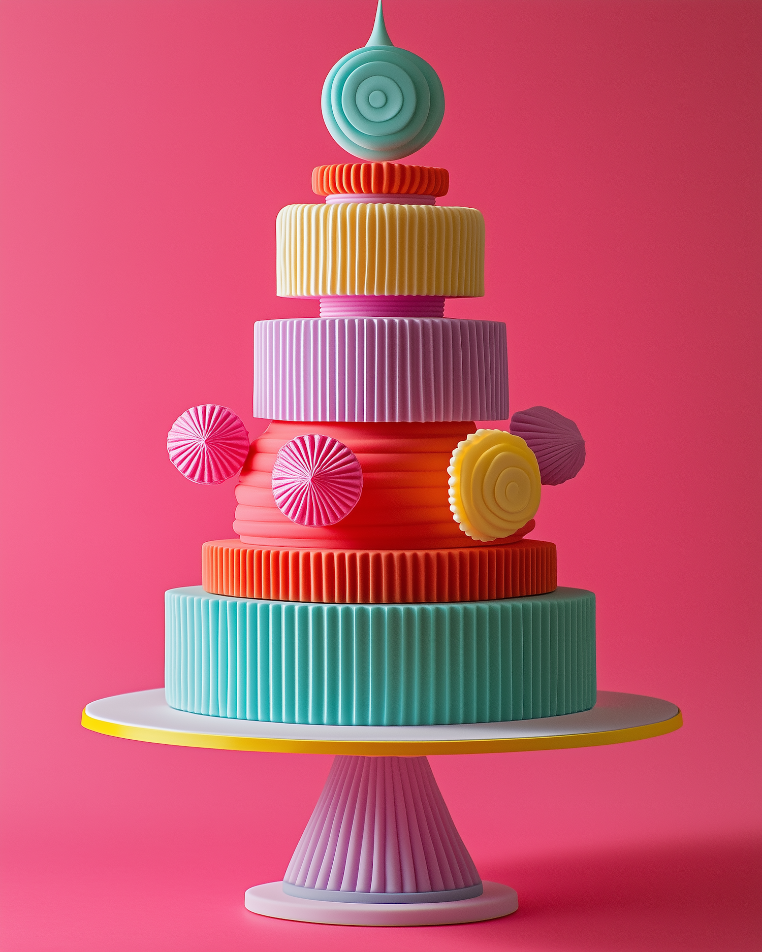 Colorful, abstract multi-tiered cake with ribbed textures and spiral decorations on a pink background.