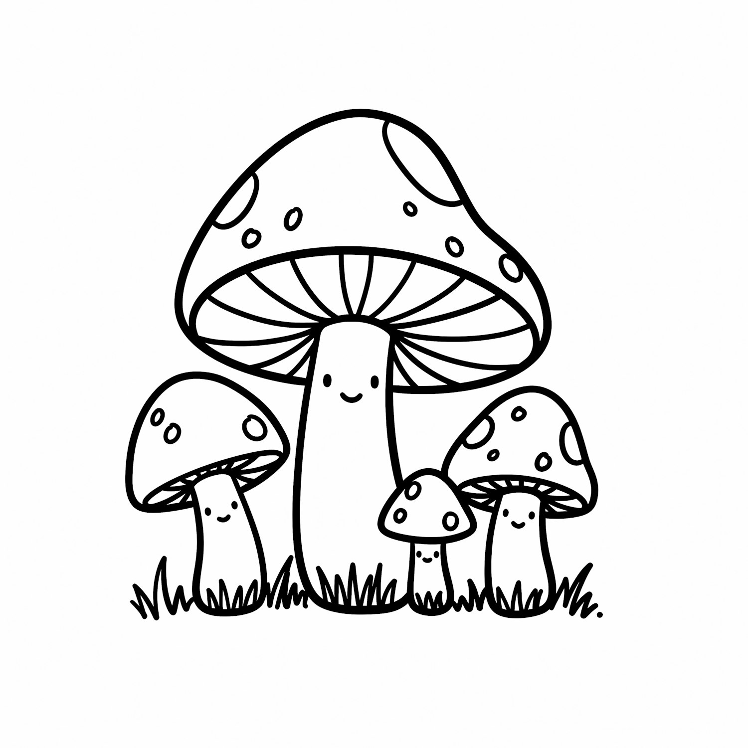 A cute black-and-white illustration of smiling mushrooms surrounded by grass, perfect for coloring or whimsical designs.
