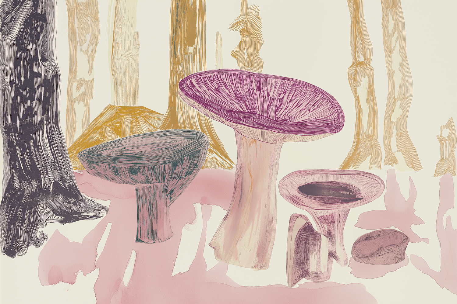 Whimsical forest illustration with oversized mushrooms in pink and purple hues, set against abstract tree trunks in muted yellows.