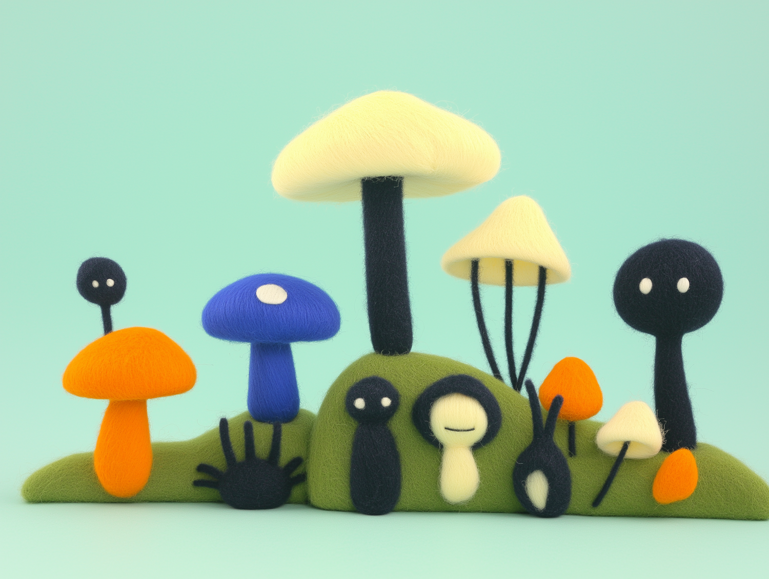 Whimsical illustration of colorful, fluffy mushrooms and abstract figures on a soft green background.
