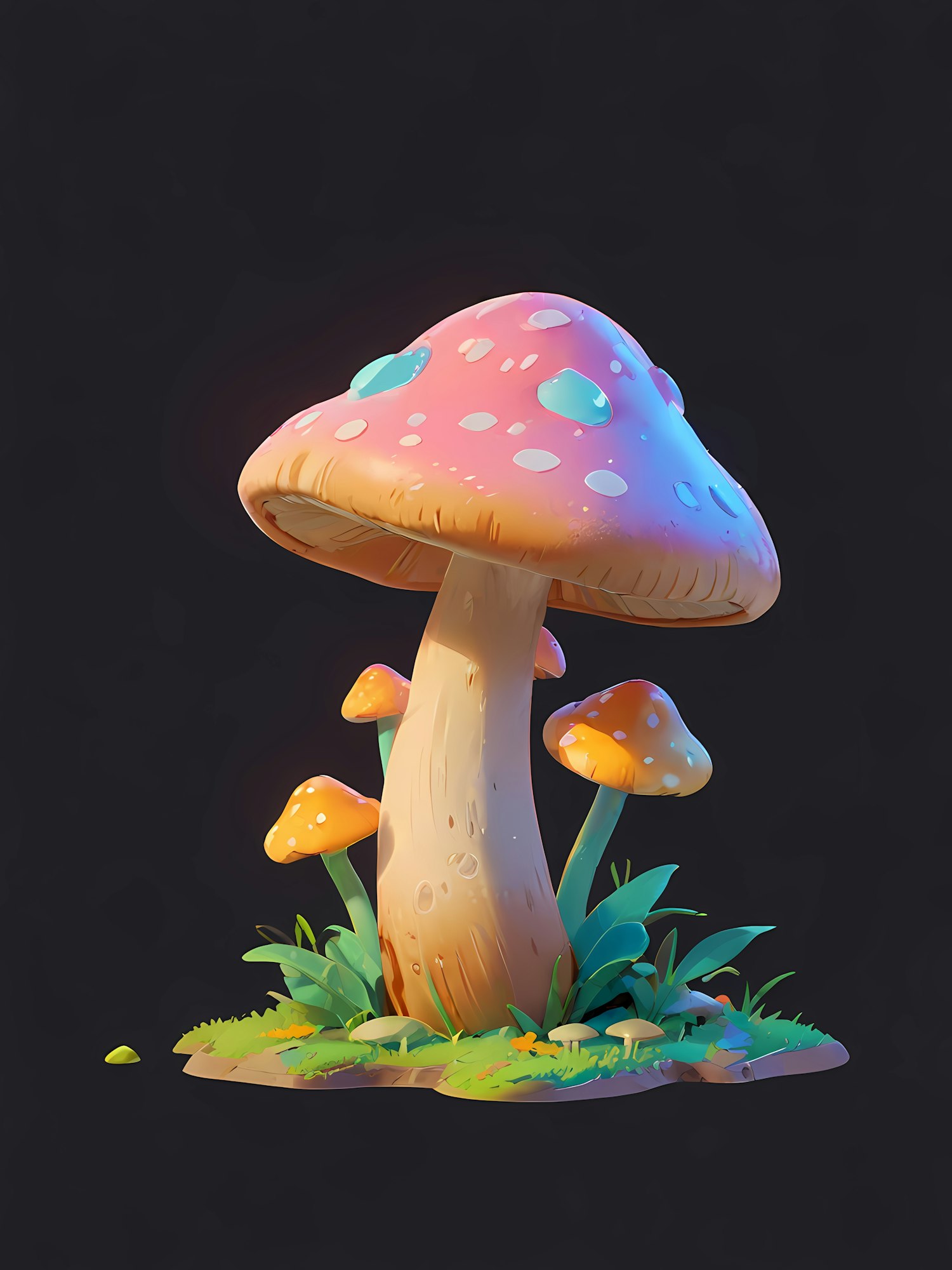 A vibrant 3D illustration of a pink and blue spotted mushroom surrounded by smaller orange mushrooms and lush greenery on a black background.