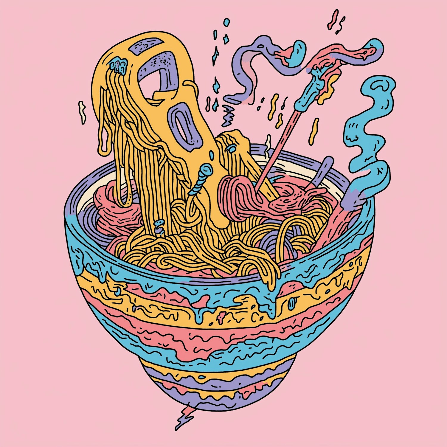 Whimsical illustration of colorful noodles with a can tab in a vibrant bowl on a pastel pink background.