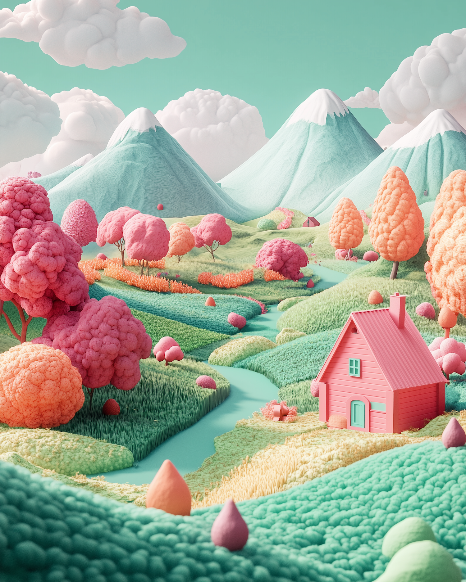 A pastel dreamscape with rolling hills, pink trees, a turquoise river, and a cozy pink house under snow-capped mountains.