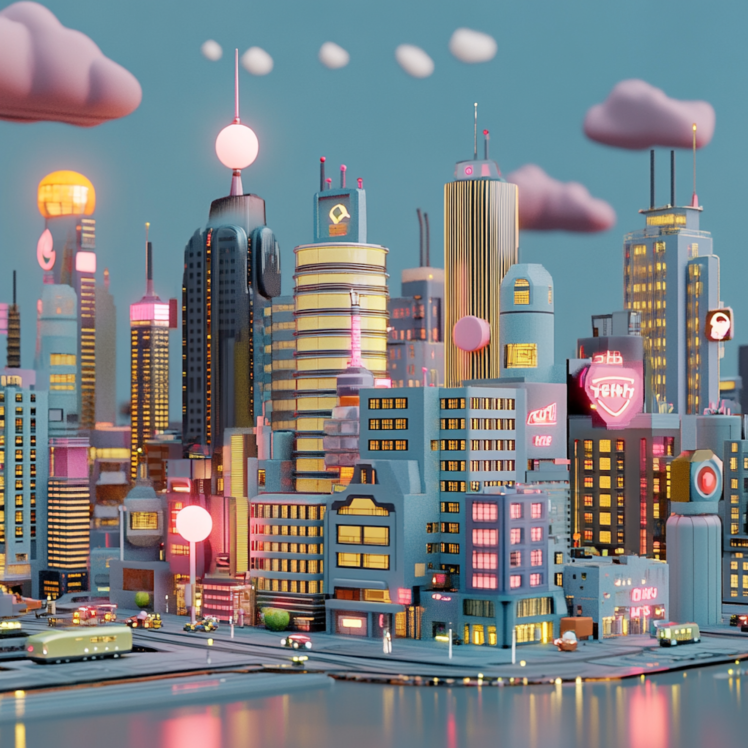Futuristic cityscape with pastel colors, neon lights, and unique skyscrapers. A whimsical, bustling urban scene with glowing orbs and clouds.