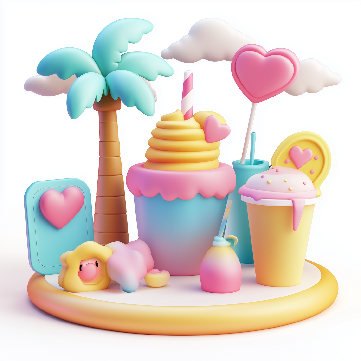 Whimsical 3D illustration with pastel colors, featuring a palm tree, cupcake, lollipop, and cute creature on a circular base.