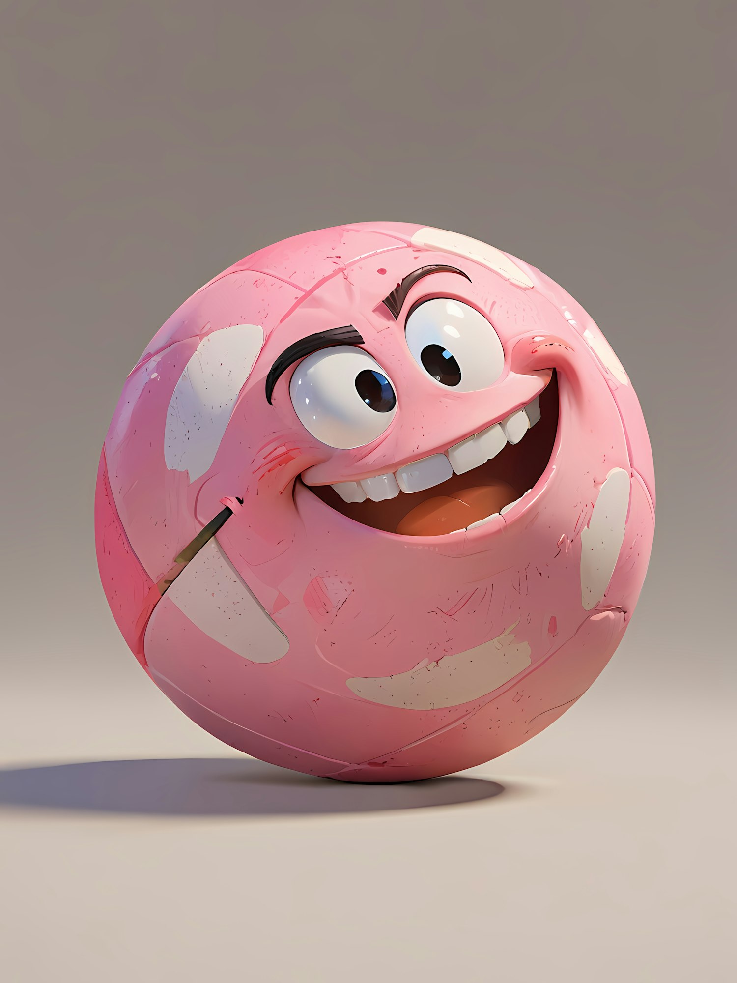 A fun 3D illustration of a pink gum-like sphere with a cheerful face, big eyes, and a wide smile, set against a neutral background.
