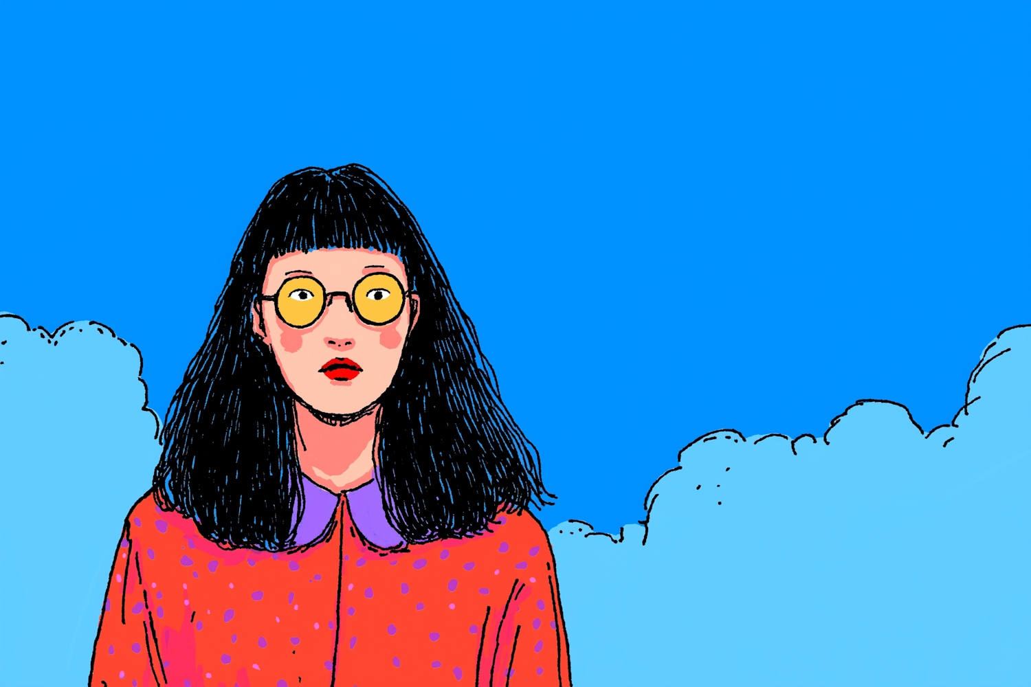Colorful illustration of a person with black hair, yellow glasses, and a red polka-dot shirt against a bright blue sky with clouds.