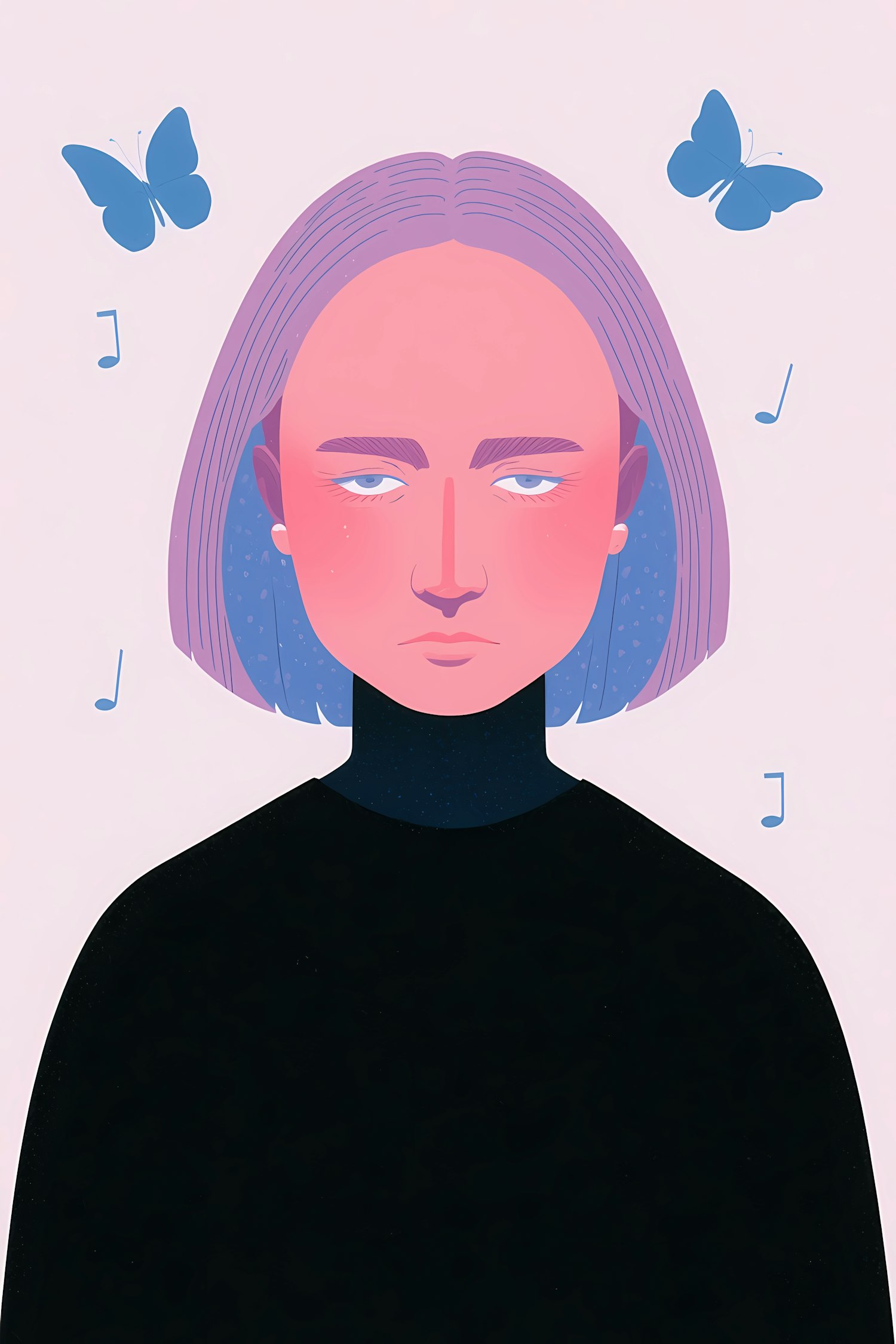 Stylized illustration of a person with purple hair, a black turtleneck, and a pastel background featuring butterflies and musical notes.
