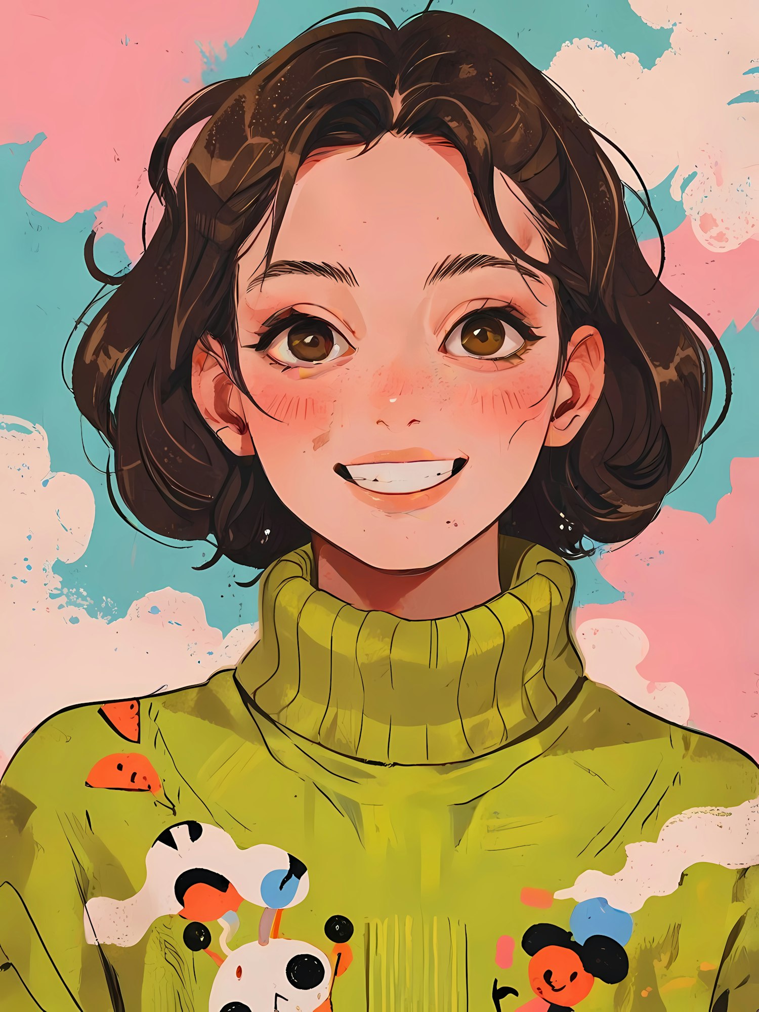 Cheerful illustration of a young woman with brown hair and eyes, wearing a green sweater with playful patterns against a pastel background.