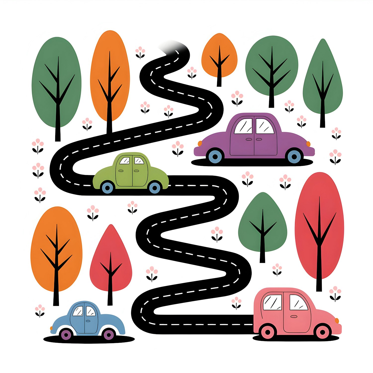 Playful illustration of a winding road with colorful cars and trees, perfect for kids' designs or cheerful decor.