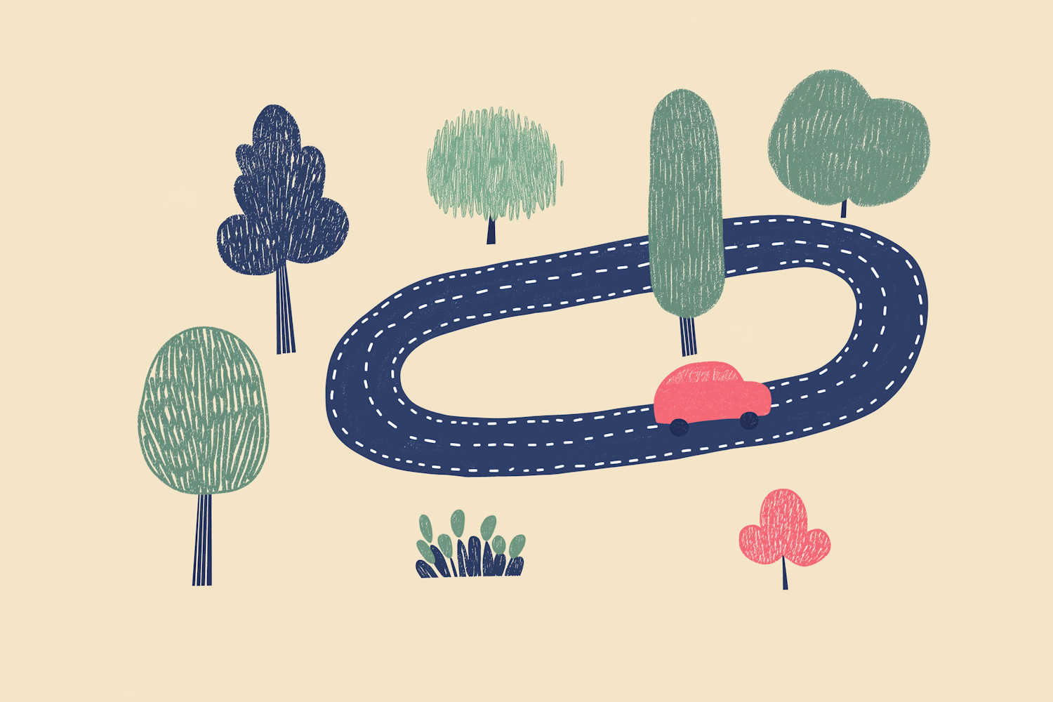 Playful illustration of a red car on a winding road surrounded by colorful trees on a beige background. Perfect for kids' designs.