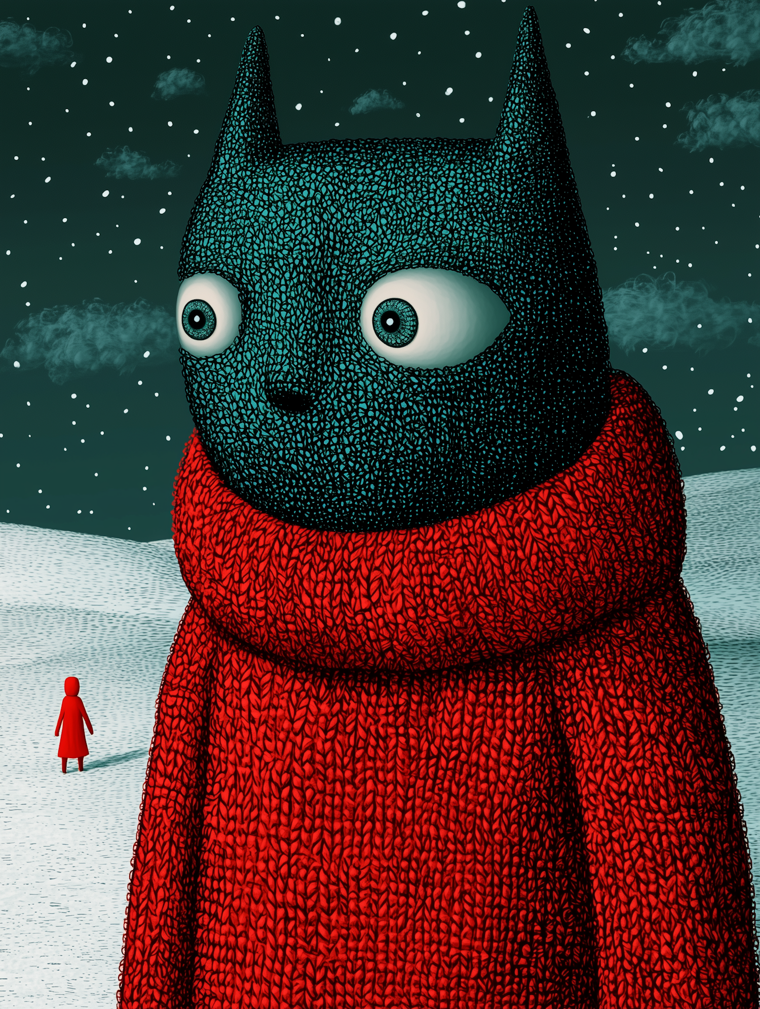 Surreal illustration of a teal cat-like creature in a red sweater, with a snowy backdrop and a mysterious red-cloaked figure.