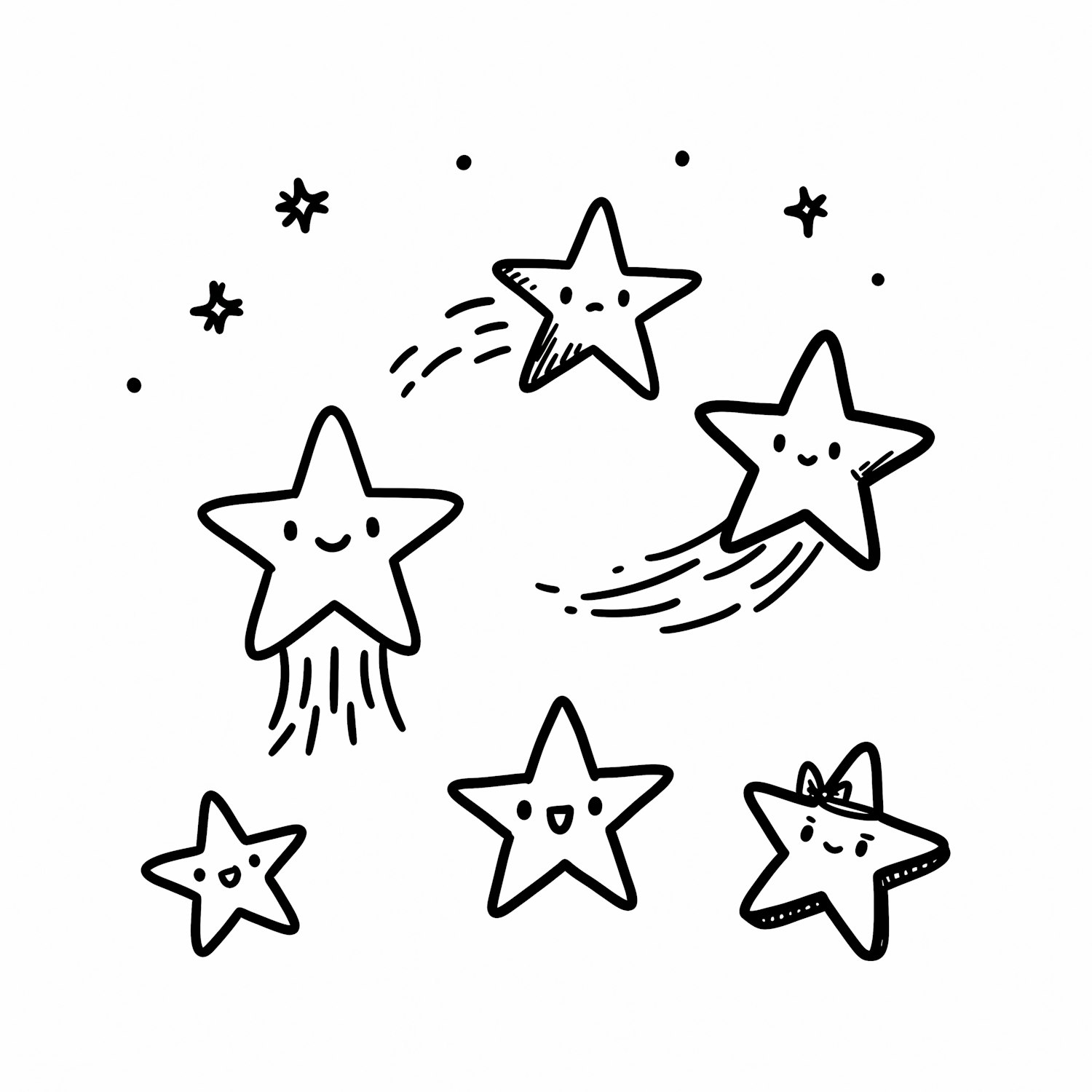 Cute black-and-white illustration of smiling stars with expressive faces and playful details, perfect for a cheerful and whimsical vibe.