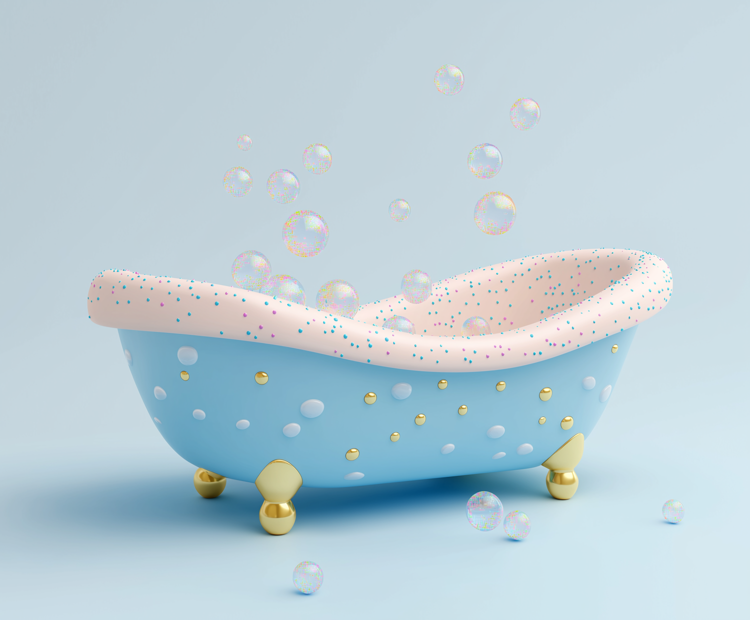 Whimsical pastel bathtub with gold accents and floating bubbles, set against a soft blue background. Playful and dreamy design.