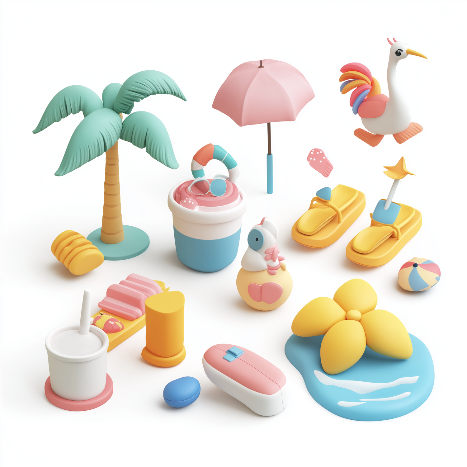 Playful summer-themed 3D objects with pastel colors, including a palm tree, flip-flops, ice cream, and a quirky bird on a white background.