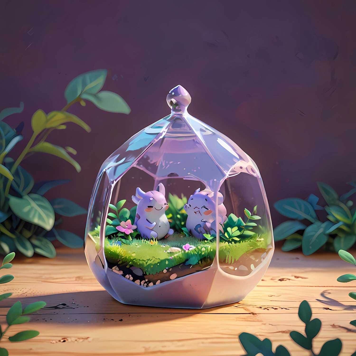 Charming terrarium with cute purple creatures, lush greenery, and pink flowers inside a gem-shaped glass container on a wooden surface.