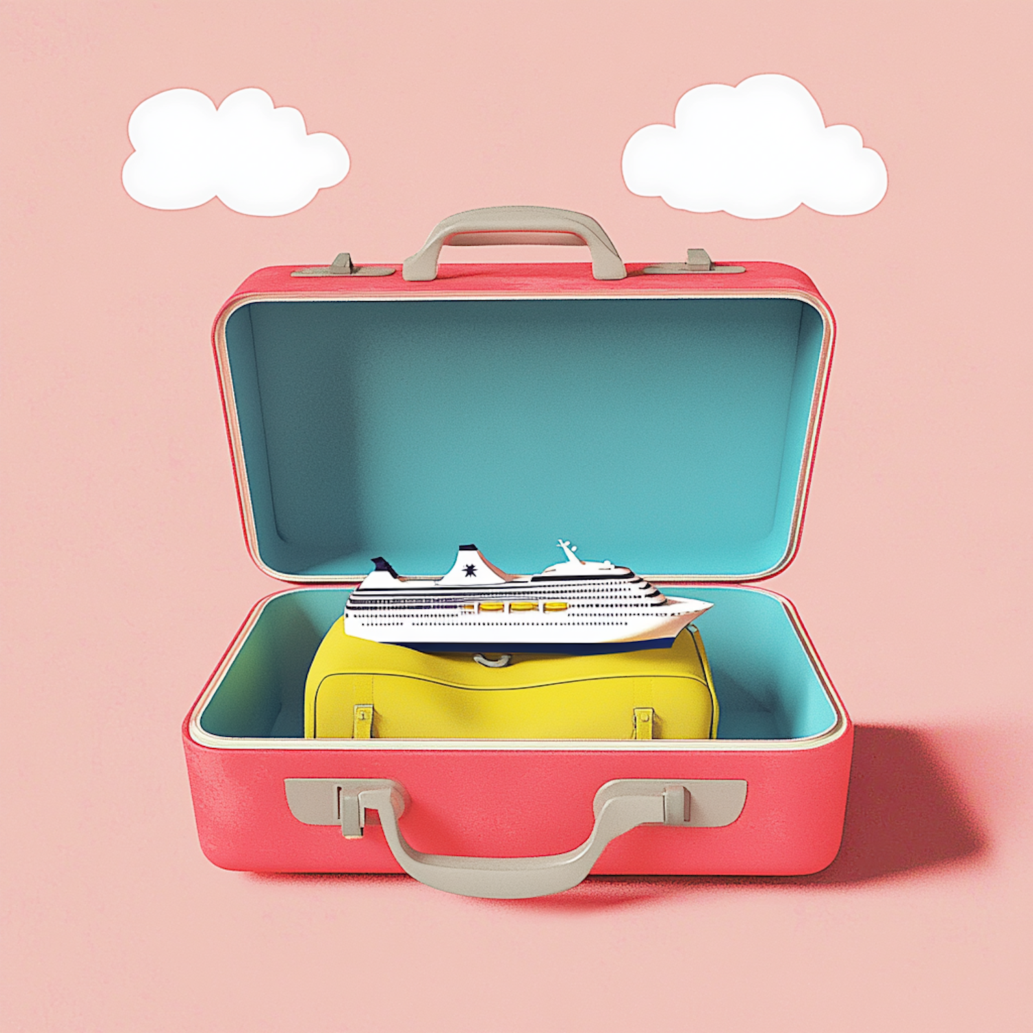 Whimsical scene with a pink suitcase, yellow bag, and a cruise ship model, set against a pastel pink background with cartoon clouds.