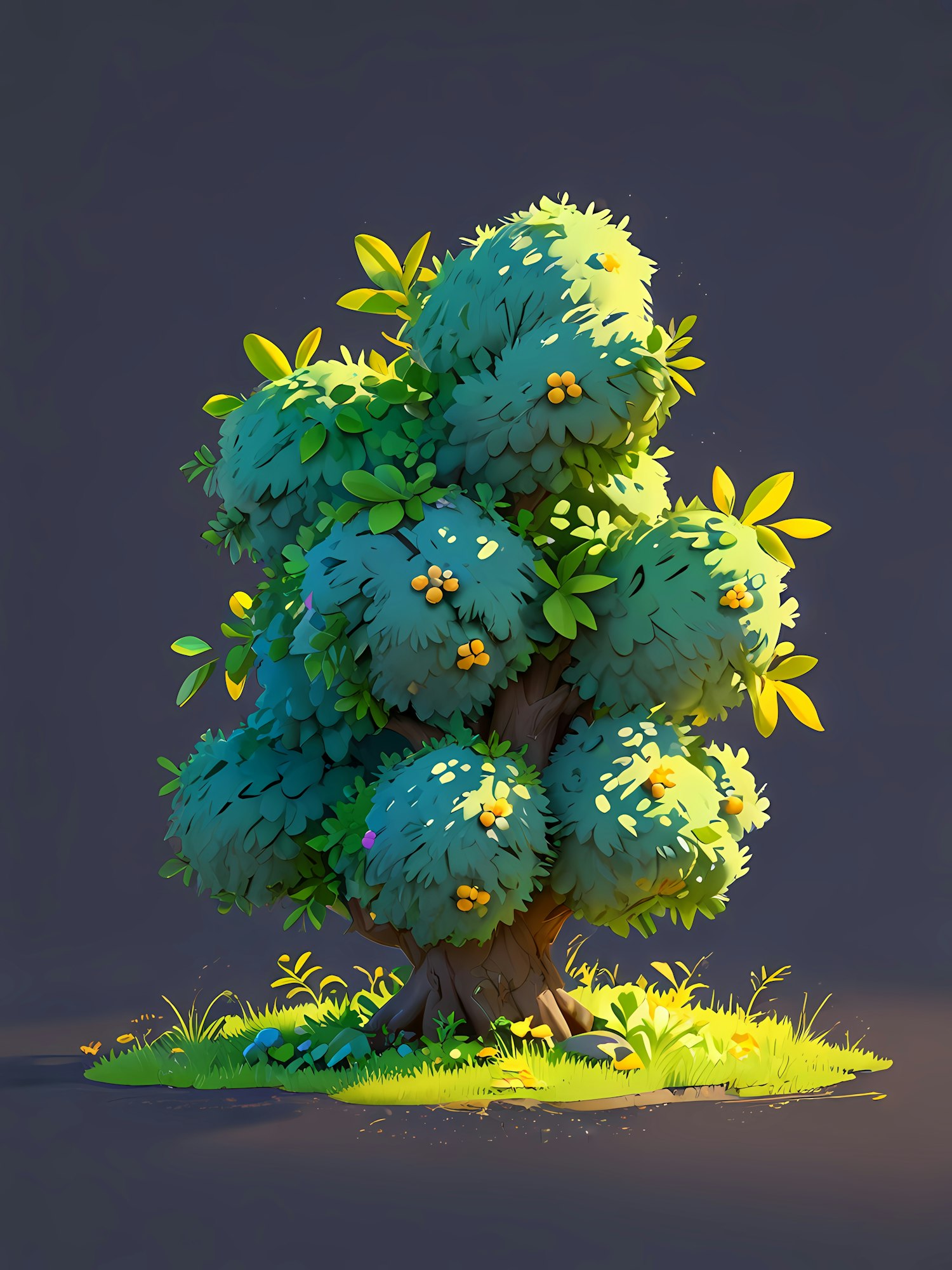 Whimsical illustration of a lush tree with golden fruits, glowing leaves, and a textured trunk on a grassy patch.
