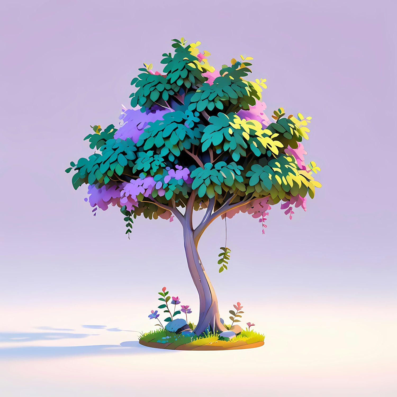 Whimsical tree with colorful foliage and flowers, set against a pastel gradient background, creating a serene and imaginative scene.