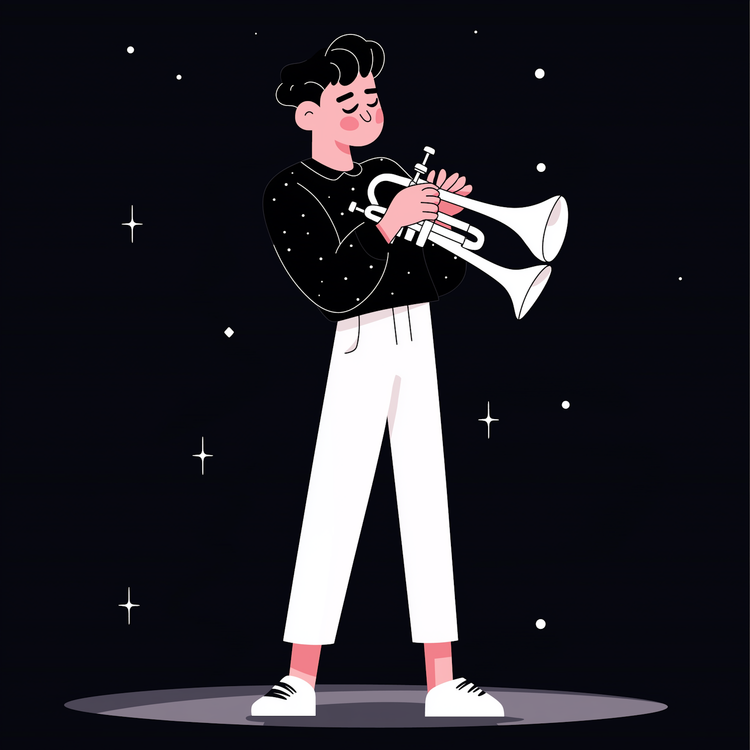 Stylized illustration of a person playing a trumpet under a starry sky, wearing a black sweater and white pants, exuding a serene vibe.