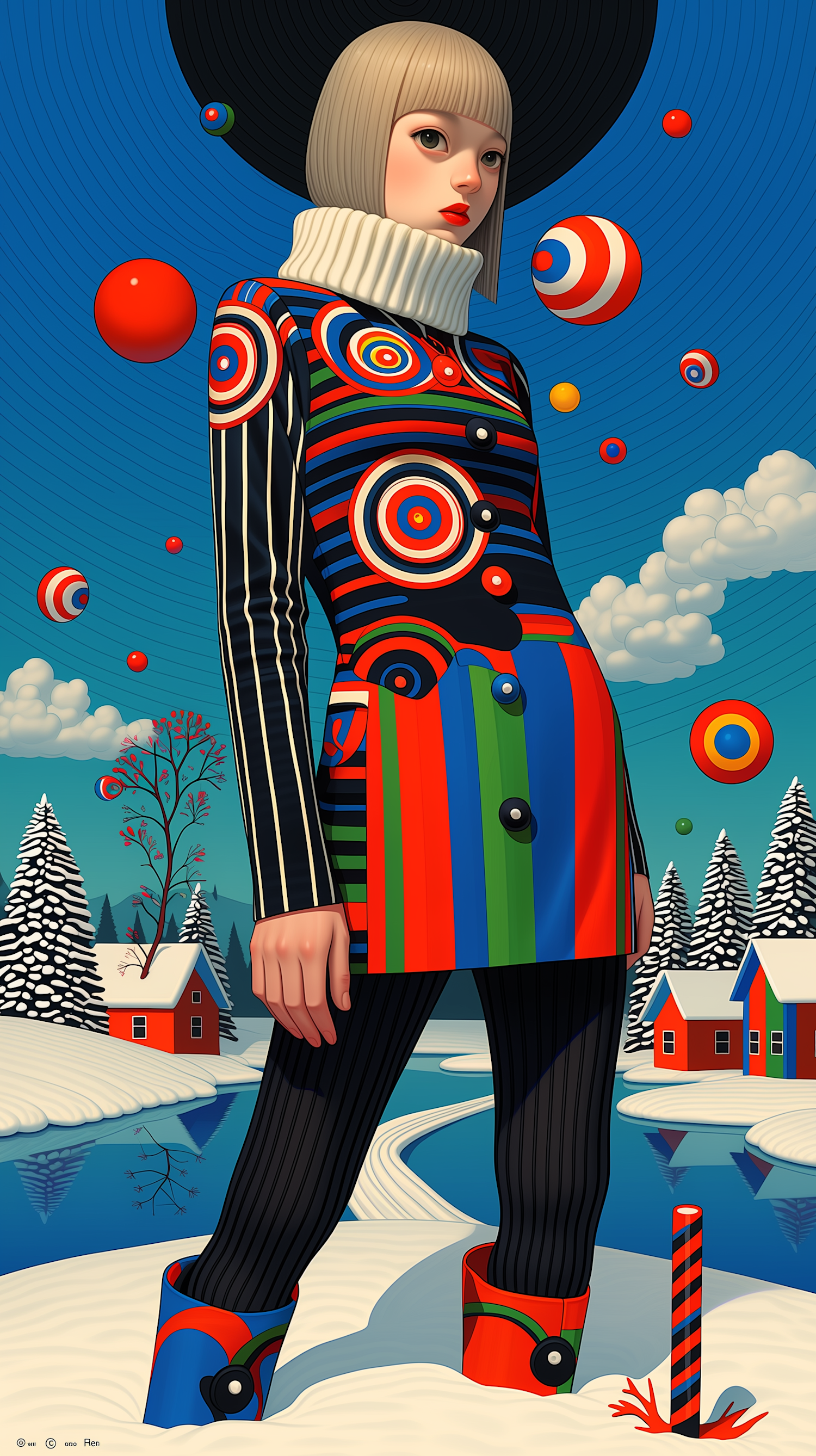 A vibrant illustration of a person in a colorful outfit amidst a snowy, surreal landscape with floating patterned spheres.