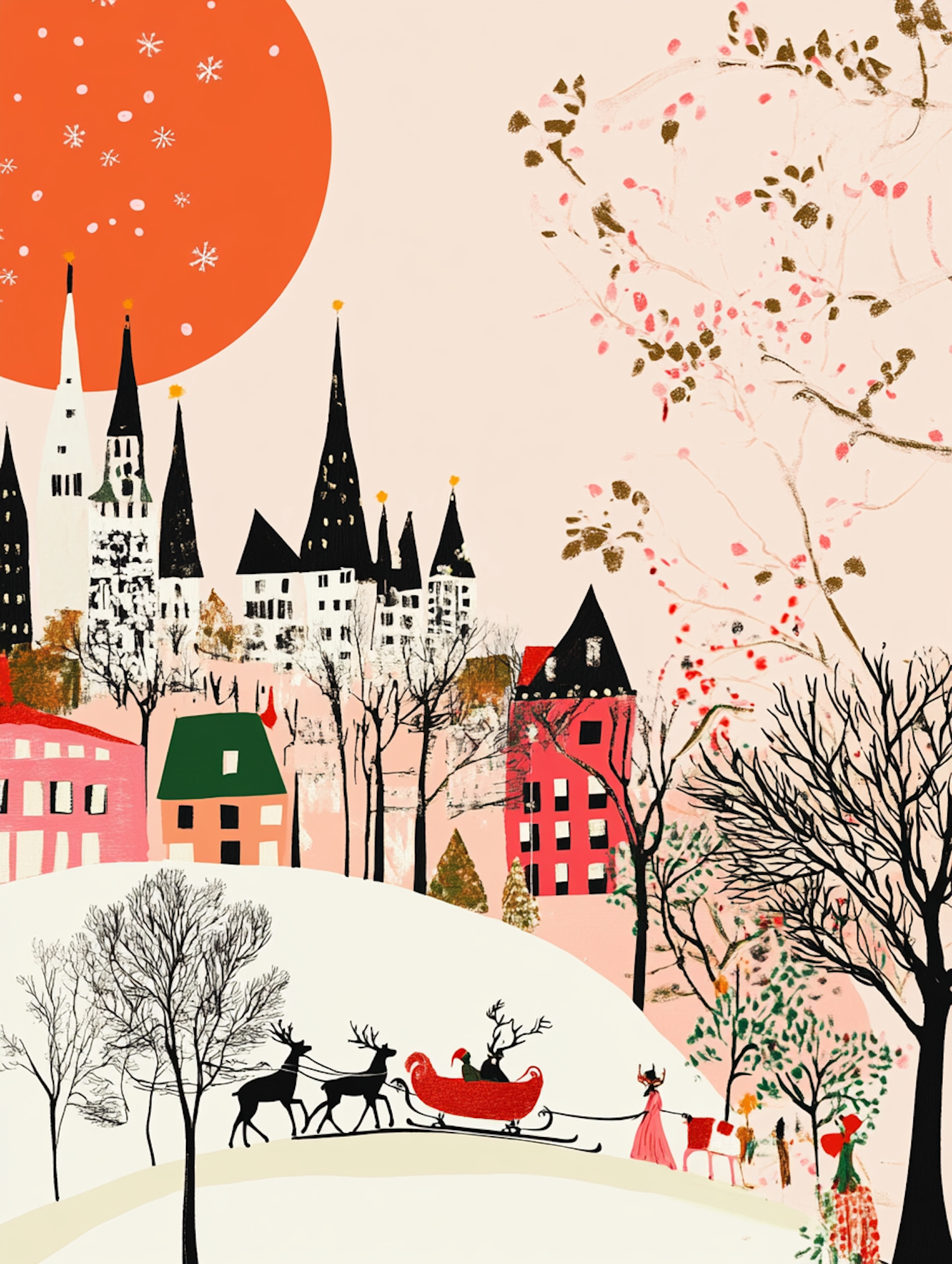 Whimsical winter scene with a red sleigh, reindeer, and a colorful village under a large orange sun with snowflakes.