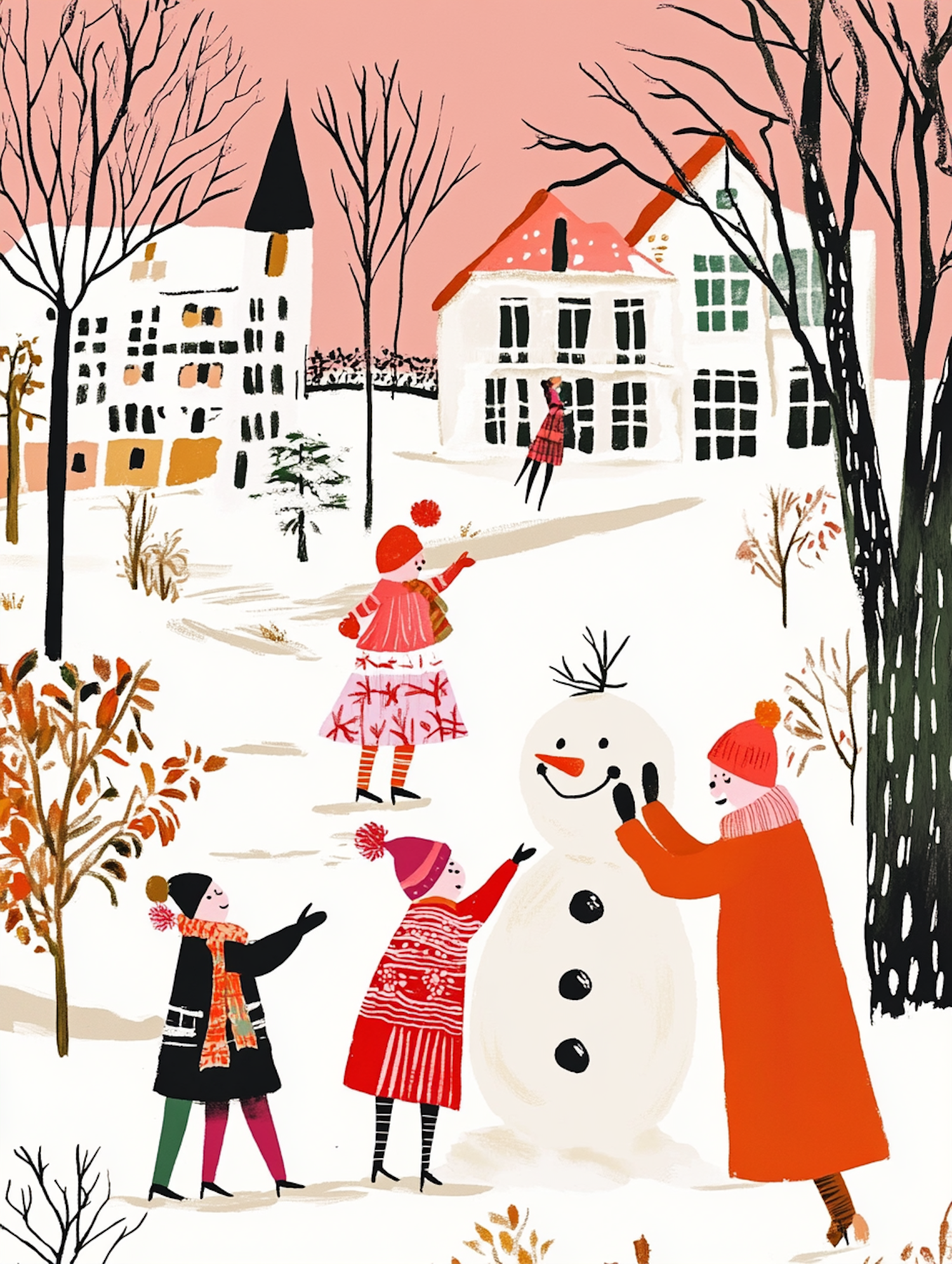Children in colorful winter clothes build a snowman in a snowy village with charming houses and a pink sky.