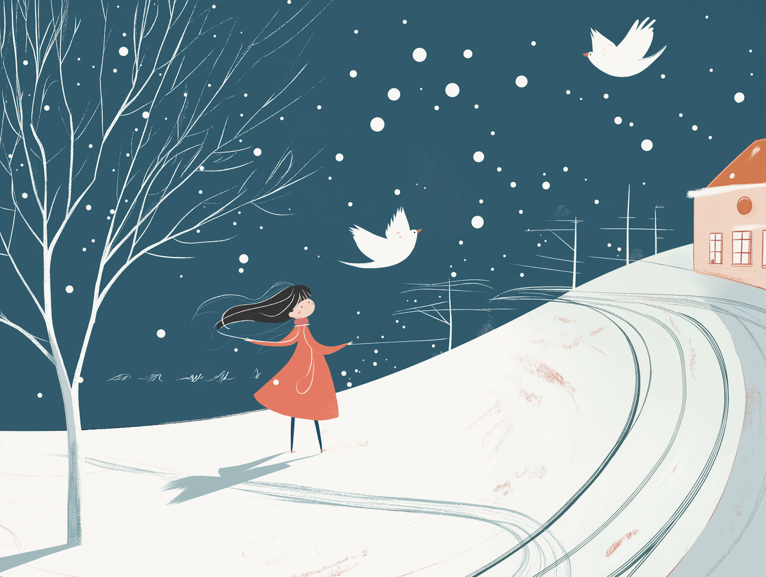 Whimsical winter scene with a girl in a red dress, snowflakes, and birds flying over a snowy hill and a quaint house.