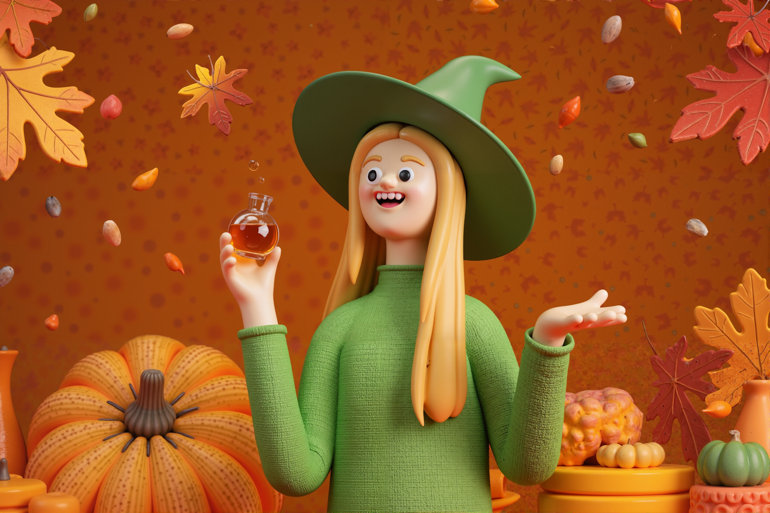 A cheerful cartoon witch in green holds a potion bottle amidst pumpkins and autumn leaves, set against a warm orange background.