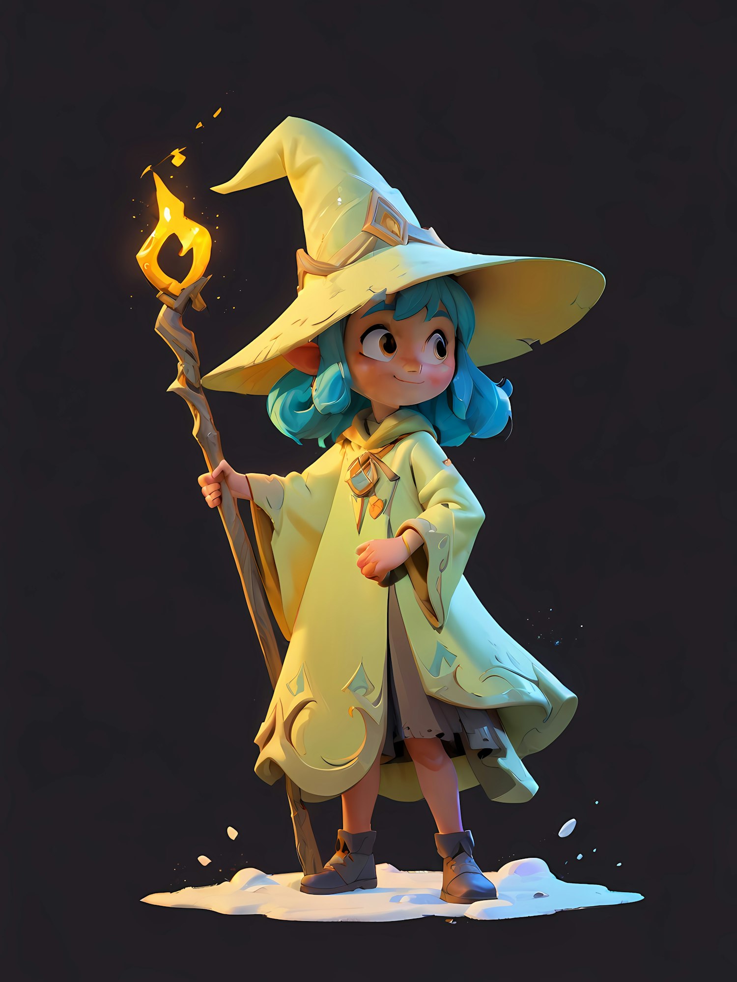 Charming 3D wizard character with blue hair, yellow hat, glowing staff, and snowy base. Perfect for fantasy and magical themes.