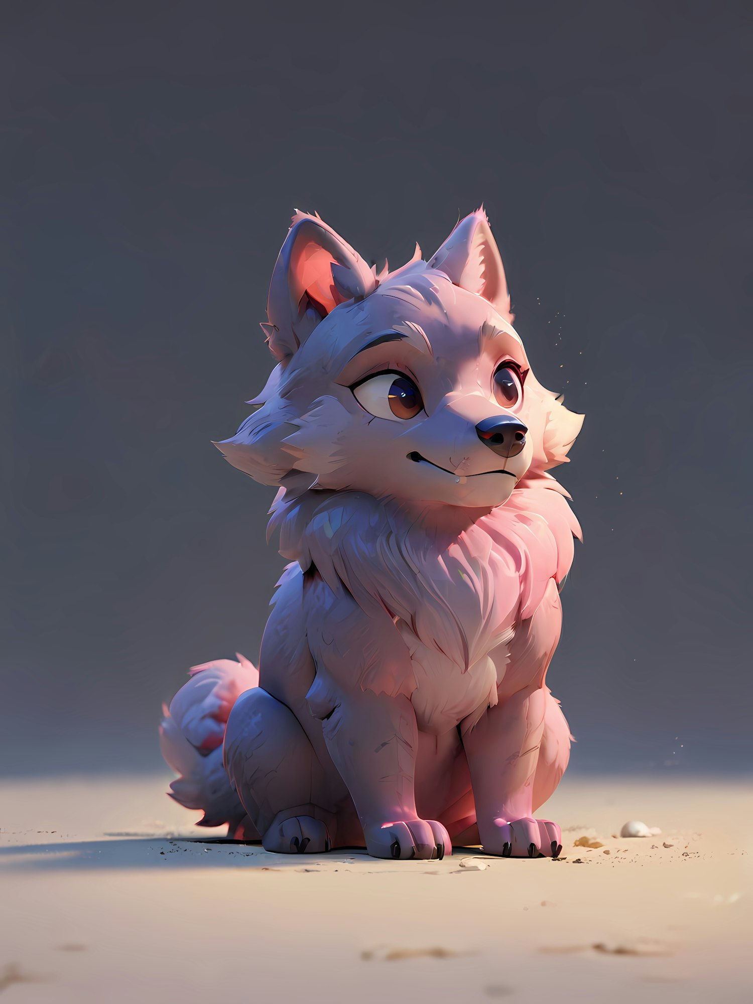 Adorable 3D wolf-like creature with pastel pink and lavender fur, sitting on sand with curious eyes and warm lighting.