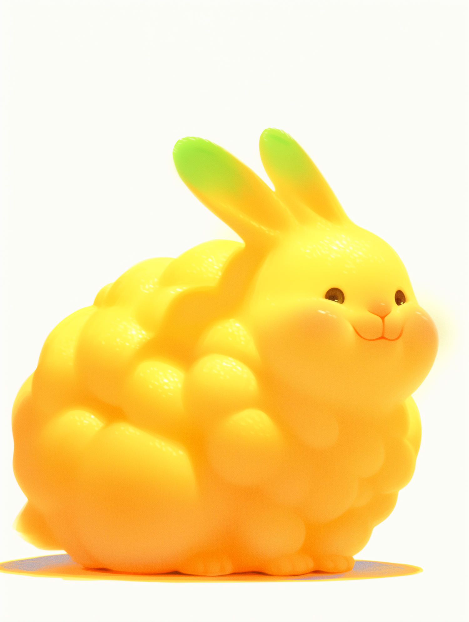 A cheerful yellow rabbit-like creature with a bubbly texture and green-tipped ears, rendered in a vibrant 3D style.