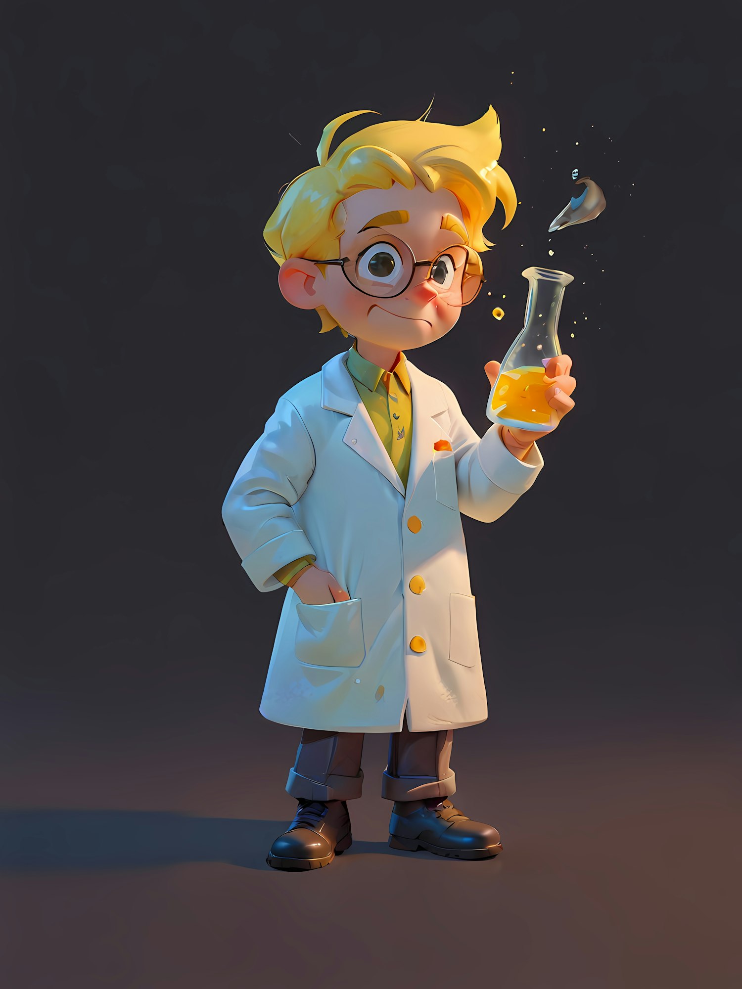 Adorable 3D illustration of a young scientist holding a glowing yellow beaker, perfect for science-themed designs or educational content.