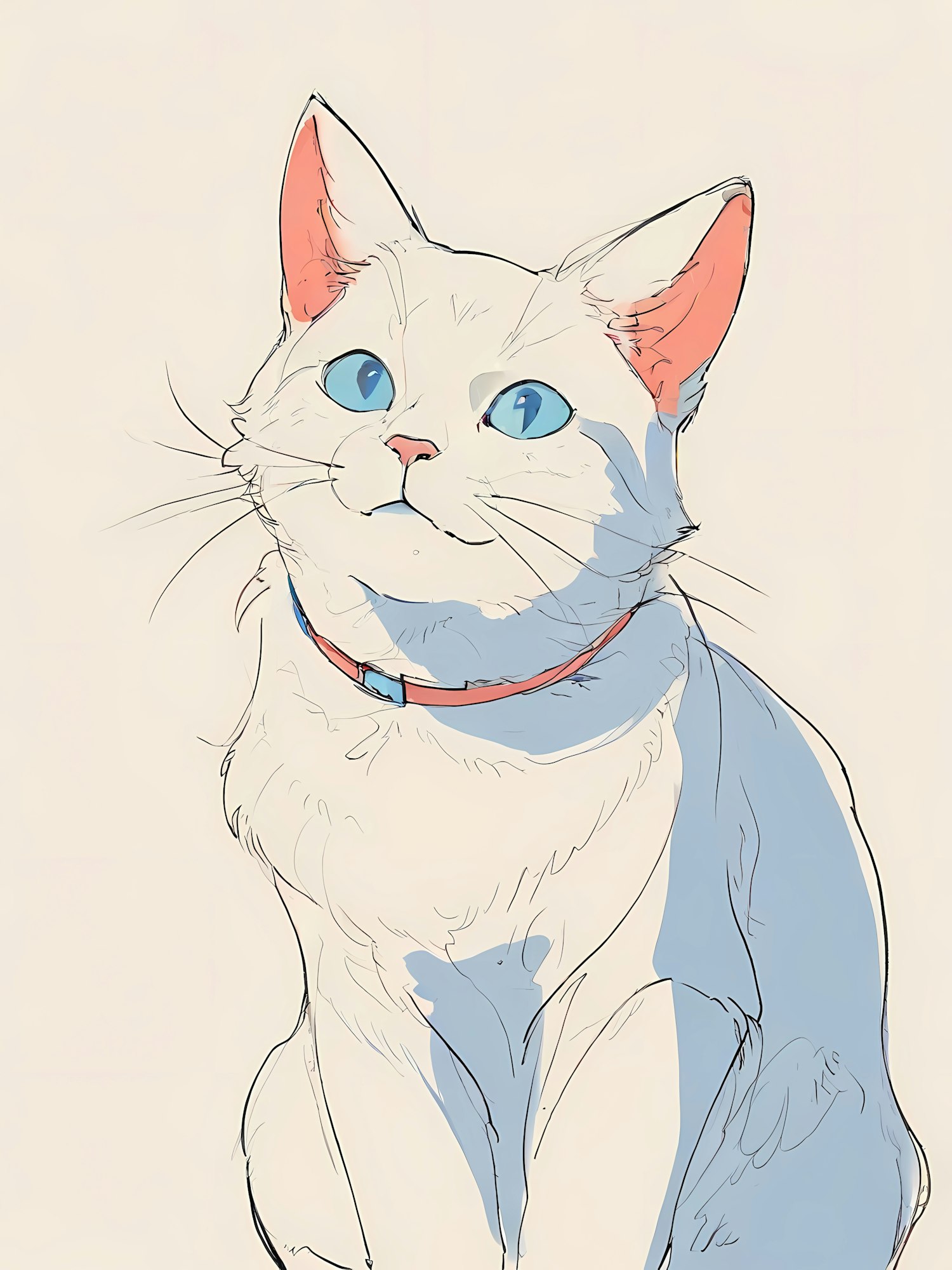 Adorable white cat illustration with blue eyes, a red collar, and a soft pastel aesthetic. Perfect for cat lovers and art enthusiasts!