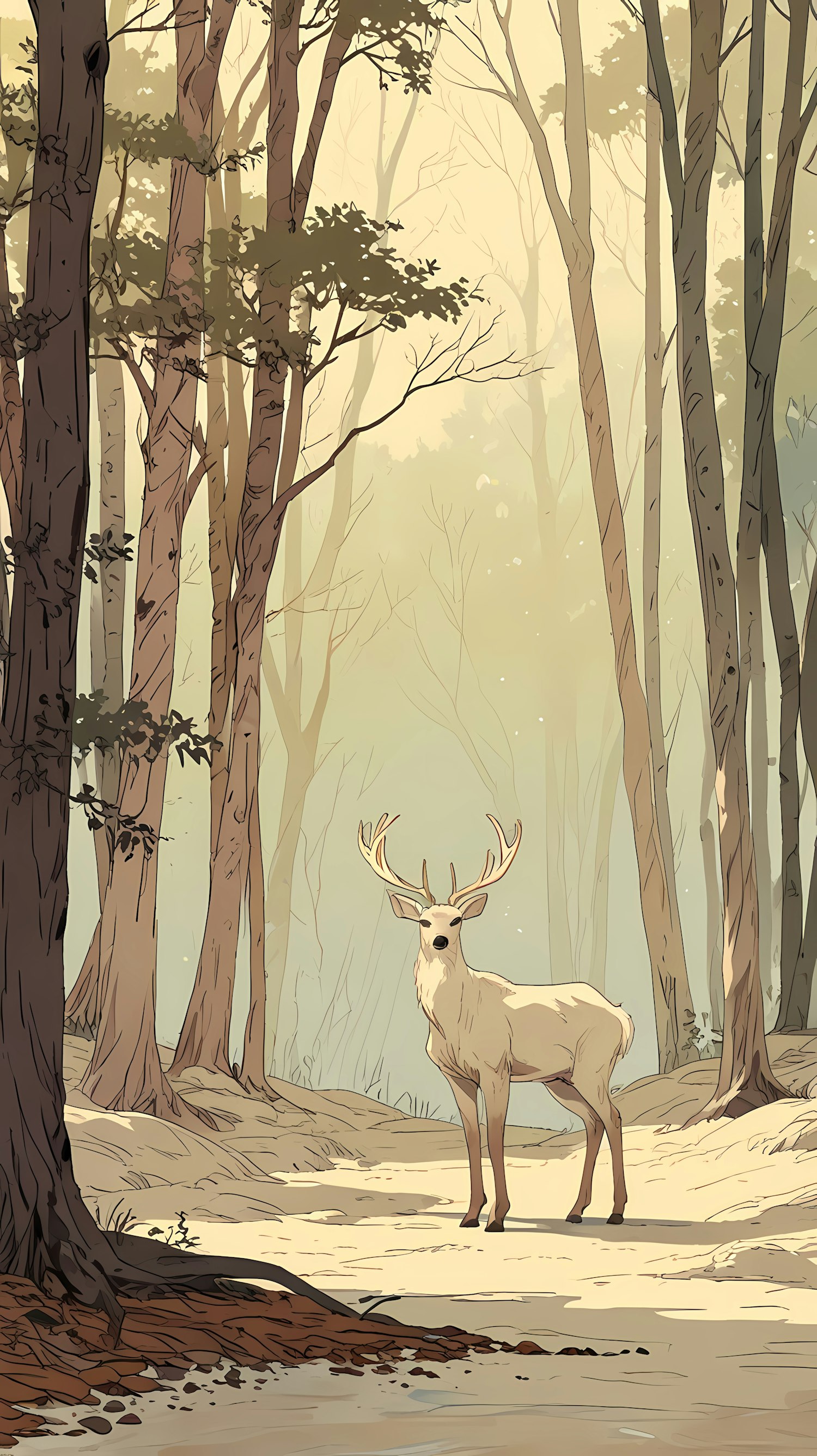 Illustration of a serene forest scene with a white deer standing gracefully amid tall trees and soft light filtering through the canopy.
