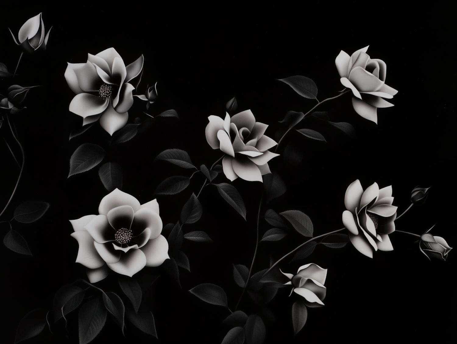 Elegant white roses on a black background, showcasing intricate details and a dramatic contrast for a timeless, minimalistic aesthetic.