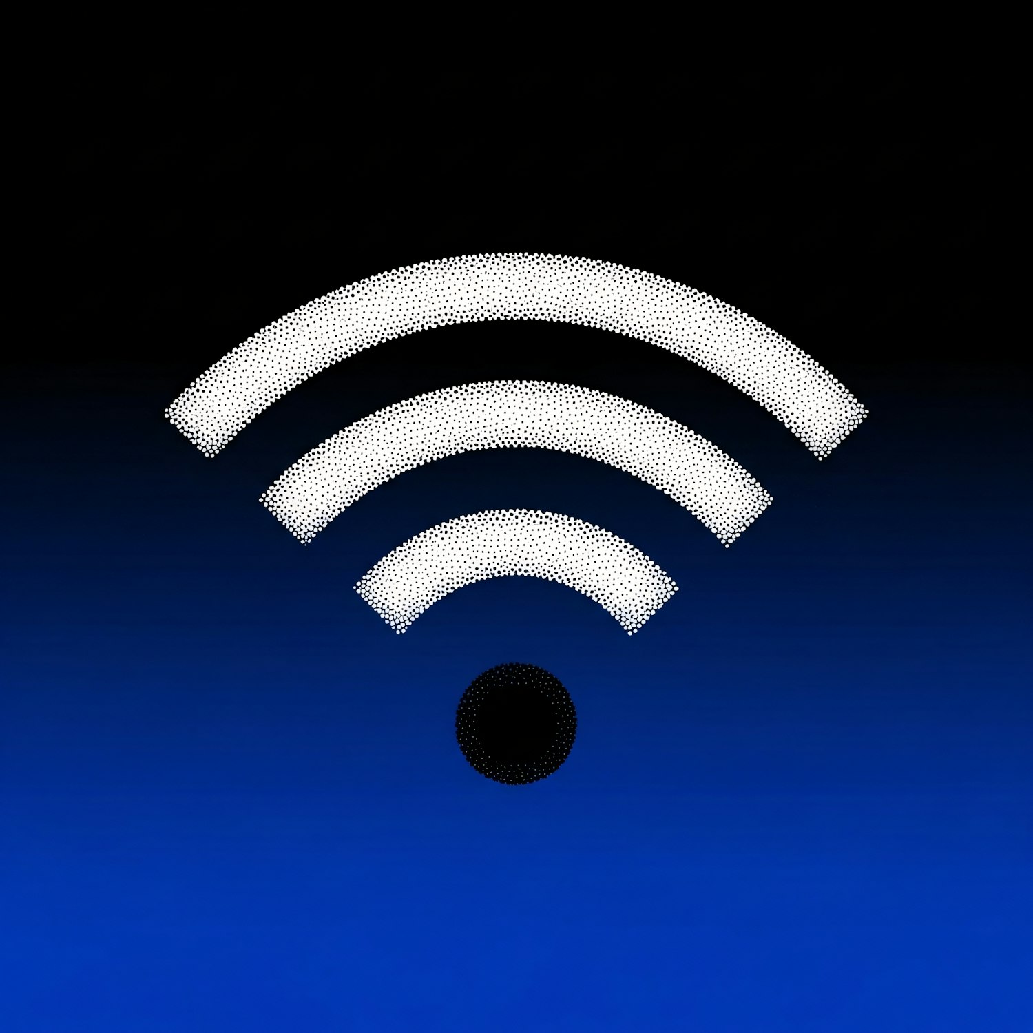 Stylized Wi-Fi signal icon with halftone texture on a gradient blue-to-black background, symbolizing wireless connectivity.