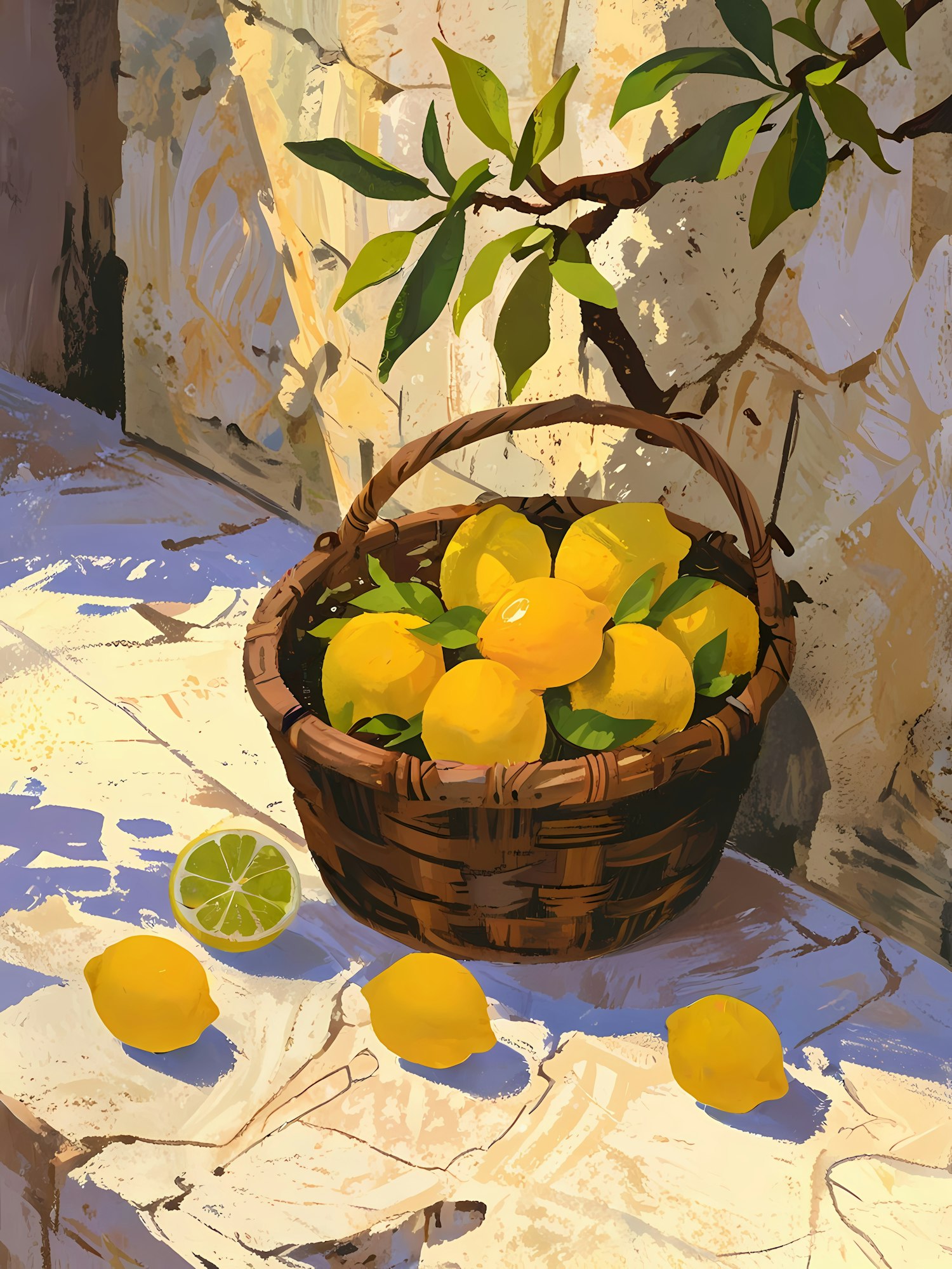 A warm, sunny scene showcasing a basket of ripe lemons surrounded by foliage and additional fruit on a rustic stone surface.
