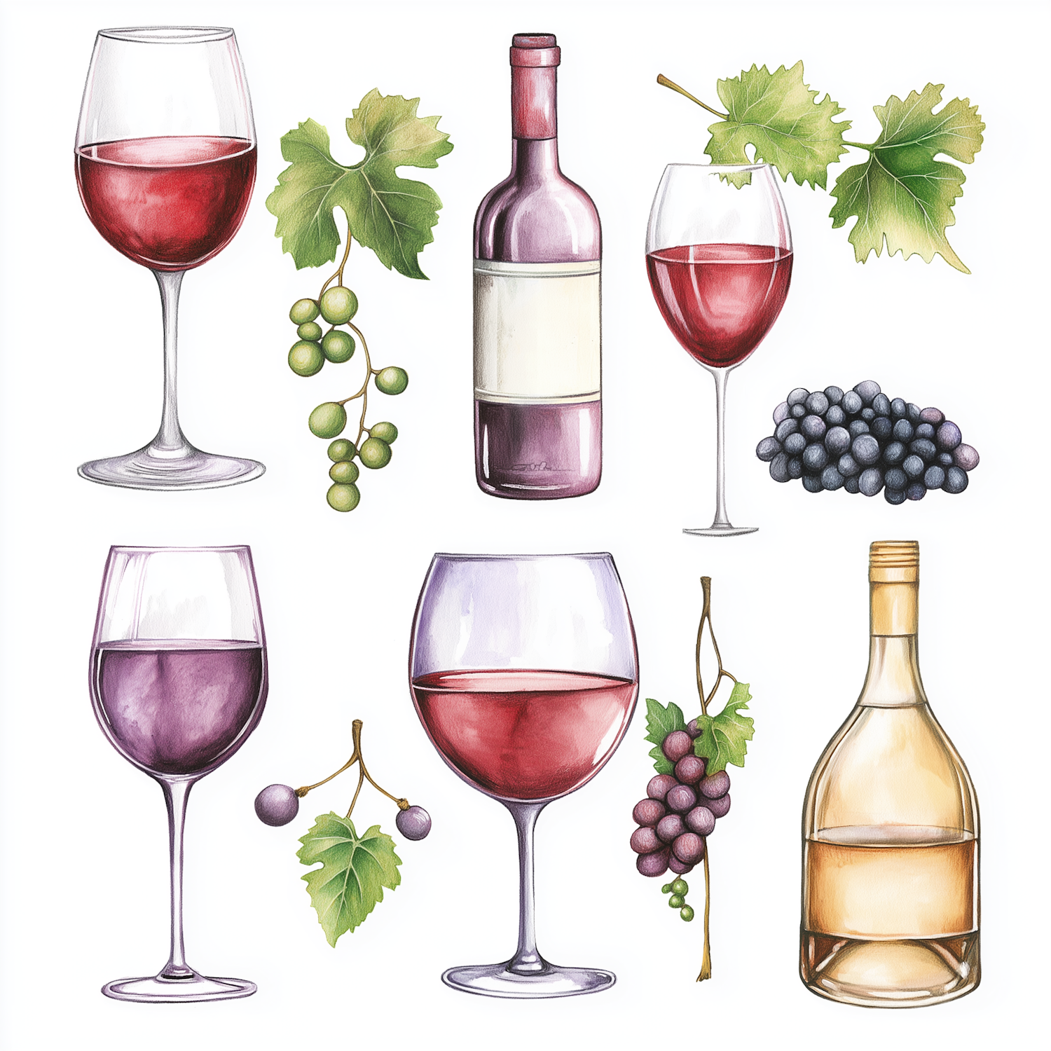 Artistic wine-themed illustration with glasses, bottles, grapes, and leaves on a clean white background. Perfect for wine lovers!