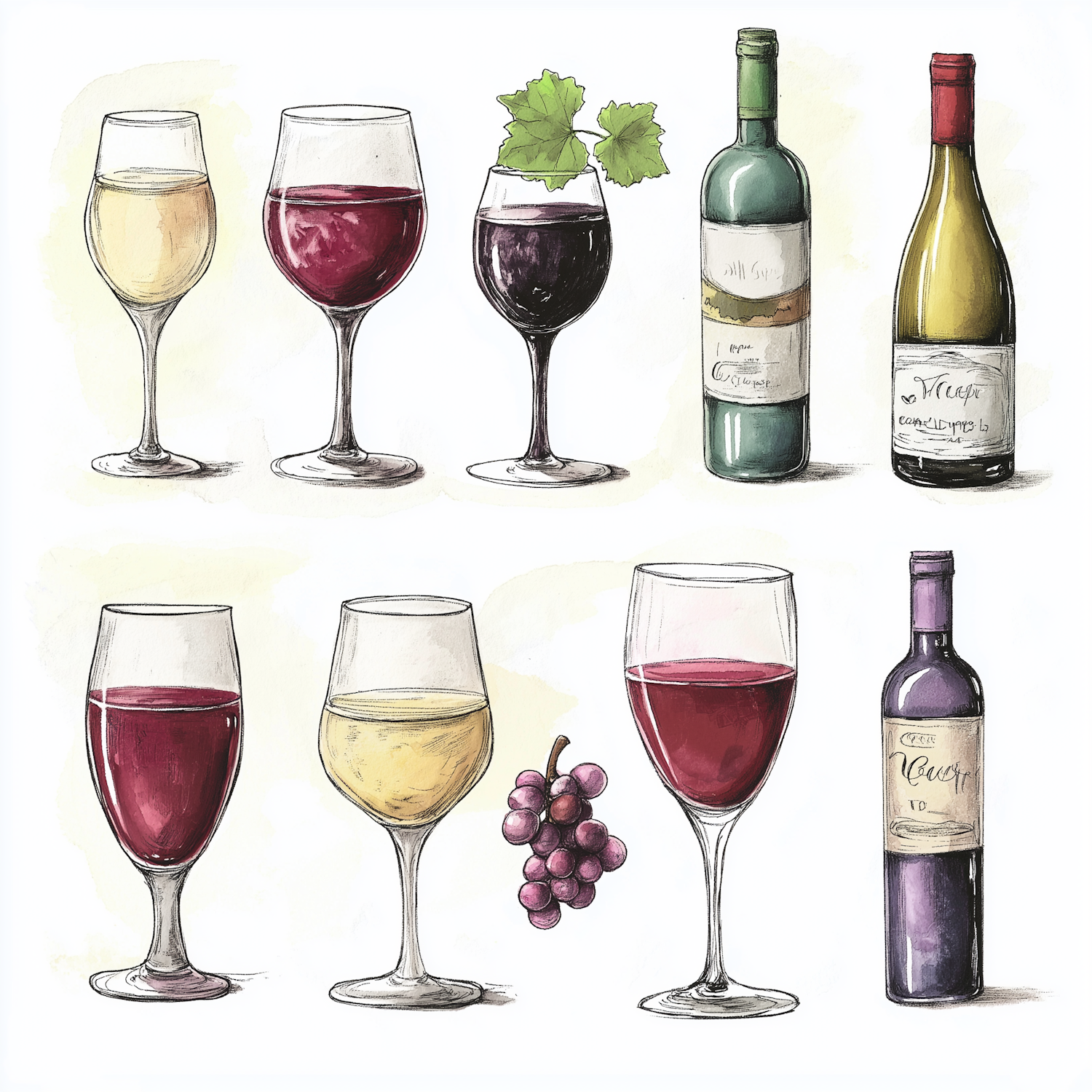 Illustration of wine glasses and bottles with red, white, and dark wine, plus grape leaves and a grape cluster for a cozy wine-themed vibe.
