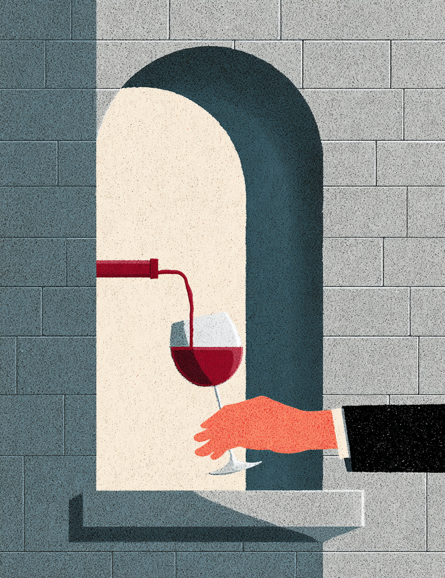 Stylized illustration of a hand receiving a glass of red wine from a spout in a stone wall niche, with elegant lighting and textures.