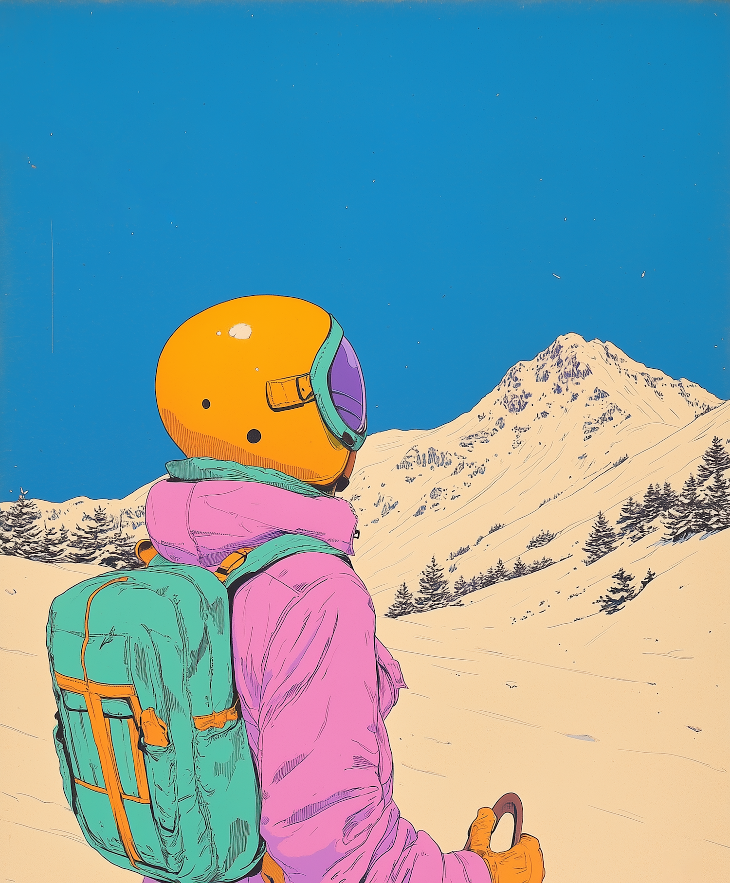 Colorful illustration of a skier in a pink jacket and orange helmet, gazing at snowy mountains under a clear blue sky.