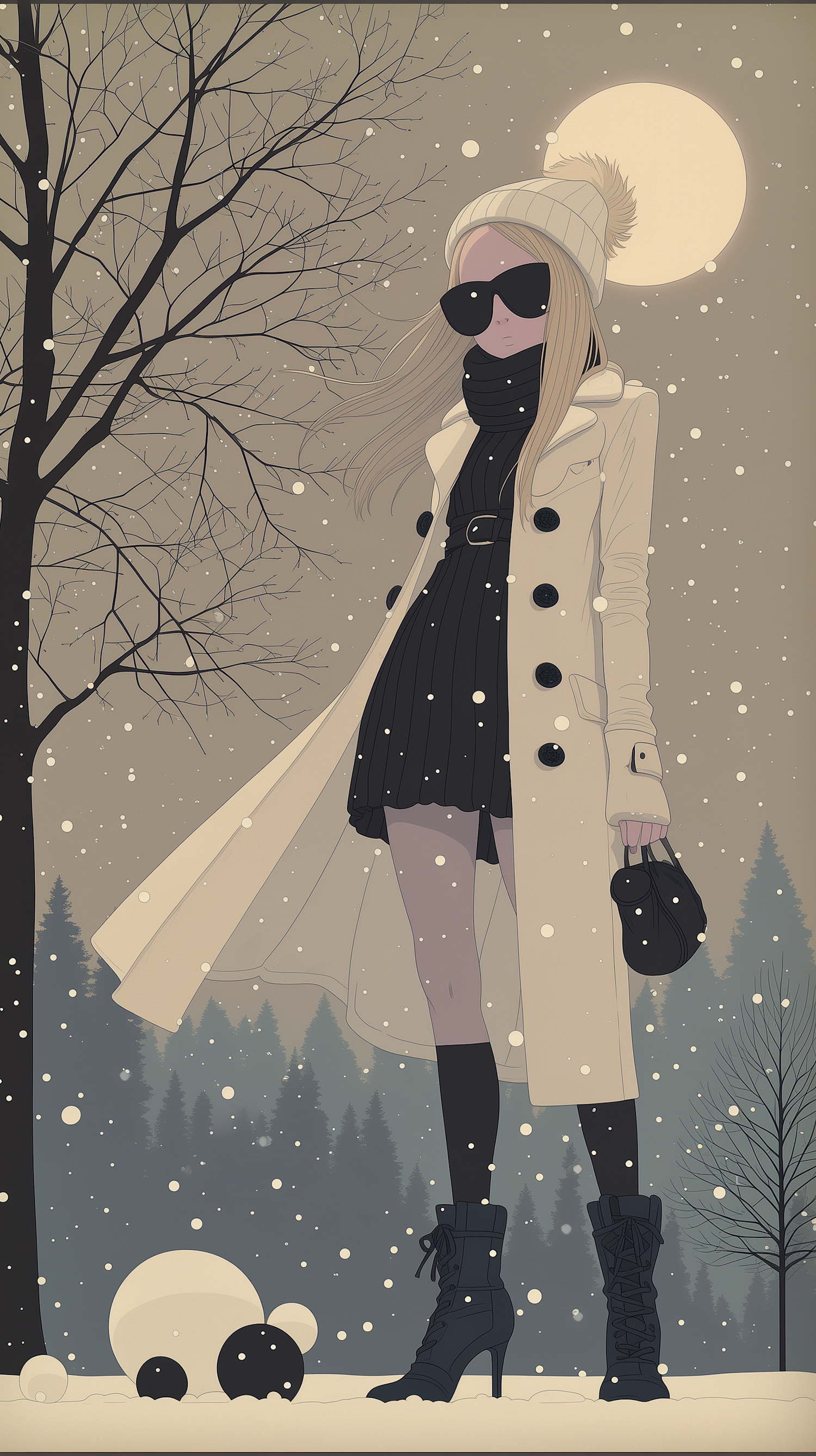 Stylish figure in a beige coat and black dress stands in a snowy winter scene with a glowing moon and falling snowflakes.