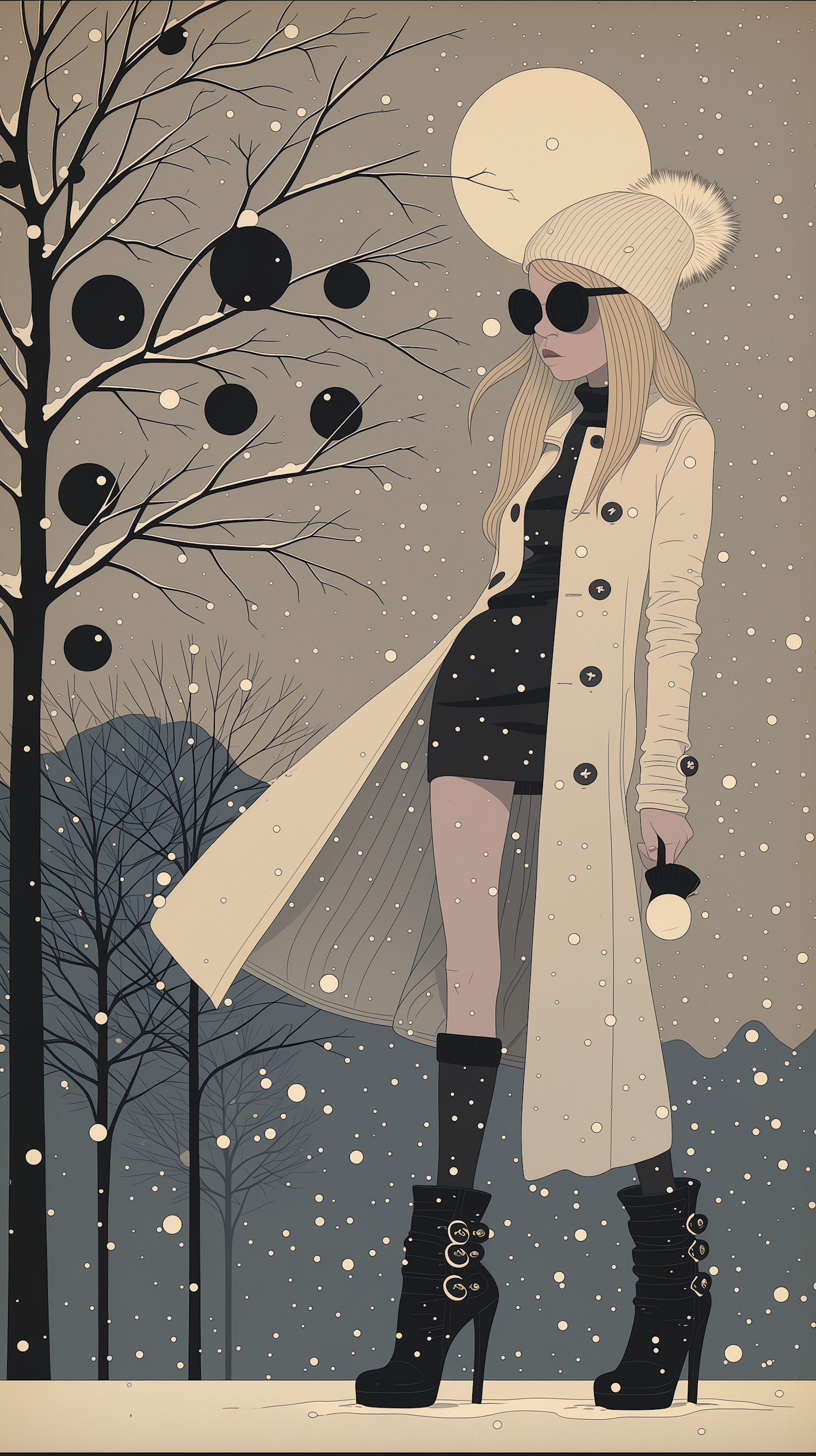 Stylized winter illustration of a fashionable woman in a coat and boots, standing in snow with a tree and moon in the background.
